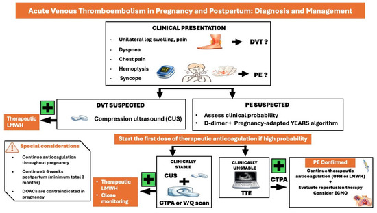 - Boureka, E.; Ralli, E.E.; Arvanitaki, A.; Lefkou, E.; Fragakis, N.; Giannakoulas, G.; Mamopoulos, A.; Dagklis, T.; Tsakiridis, I. Diagnosis and Management of Acute Venous Thromboembolism in Pregnancy and the Puerperium: A Comprehensive Review of Guidelines. Obstet. Gynecol. Surv. 2025, 80, 376–390. [Google Scholar] [CrossRef]