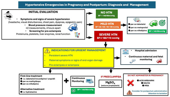 Hospitalization is necessary in cases of severe hypertension (≥160/110 mmHg) with or without preeclampsia, with administration of intravenous labetalol or nicardipine or oral short-acting nifedipine or methyldopa as first-line medications to control BP [4,39]. Intravenous hydralazine is considered a second-line option. Maternal hemodynamic monitoring (BP monitoring, ECG) and continuous cardiotocographic monitoring should also be considered.