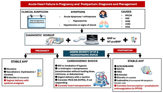 Diagnostic and treatment approach of acute heart failure in pregnancy and postpartum. ACEI: angiotensin converting enzyme inhibitor, AHF: acute heart failure, ARB: angiotensin receptor blocker, ARNI: angiotensin receptor neprilysin inhibitor, BNP: brain natriuretic peptide, CHD: congenital heart disease, HTN: hypertension, IHD: ischemic heart disease, MCS: mechanical circulatory support, MRA: mineralocorticoid receptor antagonist, PPCM: peripartum cardiomyopathy, SGLT2i: Sodium-Glucose Cotransporter-2 inhibitors, VA-ECMO: veno-arterial extracorporeal membrane oxygenation, VHD: valvular heart disease.