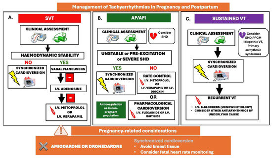 Management of tachyarrhythmias in pregnancy and postpartum; (A). SVT: supraventricular tachycardia, (B). AF: atrial fibrillation/AFl: atrial flutter, (C). VT: ventricular tachycardia. SHD: structural heart disease, PPCM: peripartum cardiomyopathy.