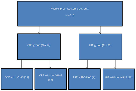 A total of 115 patients met the inclusion criteria and were included in the final analysis, with 72 patients undergoing open radical prostatectomy (ORP) and 43 patients undergoing laparoscopic radical prostatectomy (LRP). Patient selection, exclusion, and allocation according to surgical approach, together with the subsequent occurrence of vesicourethral anastomotic stricture (VUAS), are detailed in the flow diagram (Figure 1).