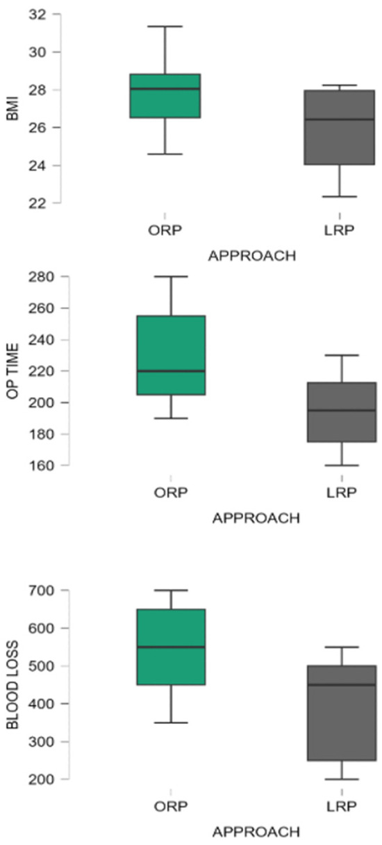 Significant differences were also observed in perioperative parameters. ORP was associated with longer operative duration (230.5 ± 25.1 min vs. 193.7 ± 20.4 min; p < 0.001), greater estimated intraoperative blood loss (536 ± 120 mL vs. 400 ± 80 mL; p < 0.001), and prolonged length of hospitalization (6.5 ± 1.2 days vs. 4.9 ± 0.8 days; p < 0.001). The distribution of BMI, operative time, and intraoperative blood loss according to surgical approach is illustrated in Figure 2.