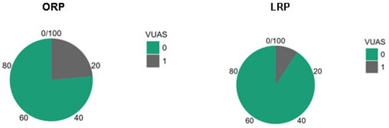 The incidence of VUAS differed according to surgical approach (Figure 3). VUAS occurred in 17 of 72 patients (23.6%) following ORP and in 4 of 43 patients (9.3%) following LRP. The absolute difference in stricture rates between approaches was 14.3 percentage points. Although the incidence was numerically lower in the laparoscopic group, this difference did not reach statistical significance in unadjusted comparison (p = 0.063).