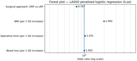 In the primary adjusted model (Model 2), which included surgical approach together with selected perioperative variables (BMI, operative time, and estimated blood loss), higher BMI and longer operative duration were independently associated with increased odds of VUAS. The adjusted odds ratios and 95% confidence intervals for all predictors included in this model are presented in Table 3 and illustrated graphically in Figure 4. In this model, the estimated effect of surgical approach showed substantial imprecision, with wide confidence intervals, reflecting the small number of VUAS events in the laparoscopic group. The penalized model retained surgical approach, body mass index, operative time and blood loss as predictors with non-zero coefficients. The resulting odds ratios are shown in Table 3 and are illustrated graphically in Figure 5. All reported odds ratios for continuous variables correspond to a one standard deviation increase due to internal standardization. Penalized models do not provide conventional p-values or confidence intervals.