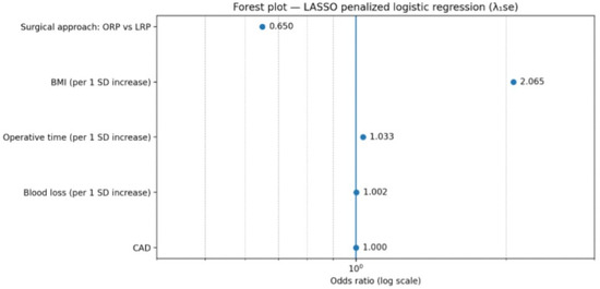 A secondary adjusted model incorporating coronary artery disease as an additional covariate (Model 3) yielded comparable results (Table 4). BMI and operative time remained consistently associated with VUAS, whereas coronary artery disease did not demonstrate an independent association. The direction and magnitude of the surgical approach coefficient were similar to those observed in Model 2, although confidence intervals remained wide. The penalized model retained surgical approach, body mass index, operative time and blood loss as predictors with non-zero coefficients, while coronary artery disease was not retained after penalization. The resulting odds ratios are shown in Table 4 and are illustrated graphically in Figure 6. All reported odds ratios for continuous variables correspond to a one standard deviation increase due to internal standardization. Penalized models do not provide conventional p-values or confidence intervals.