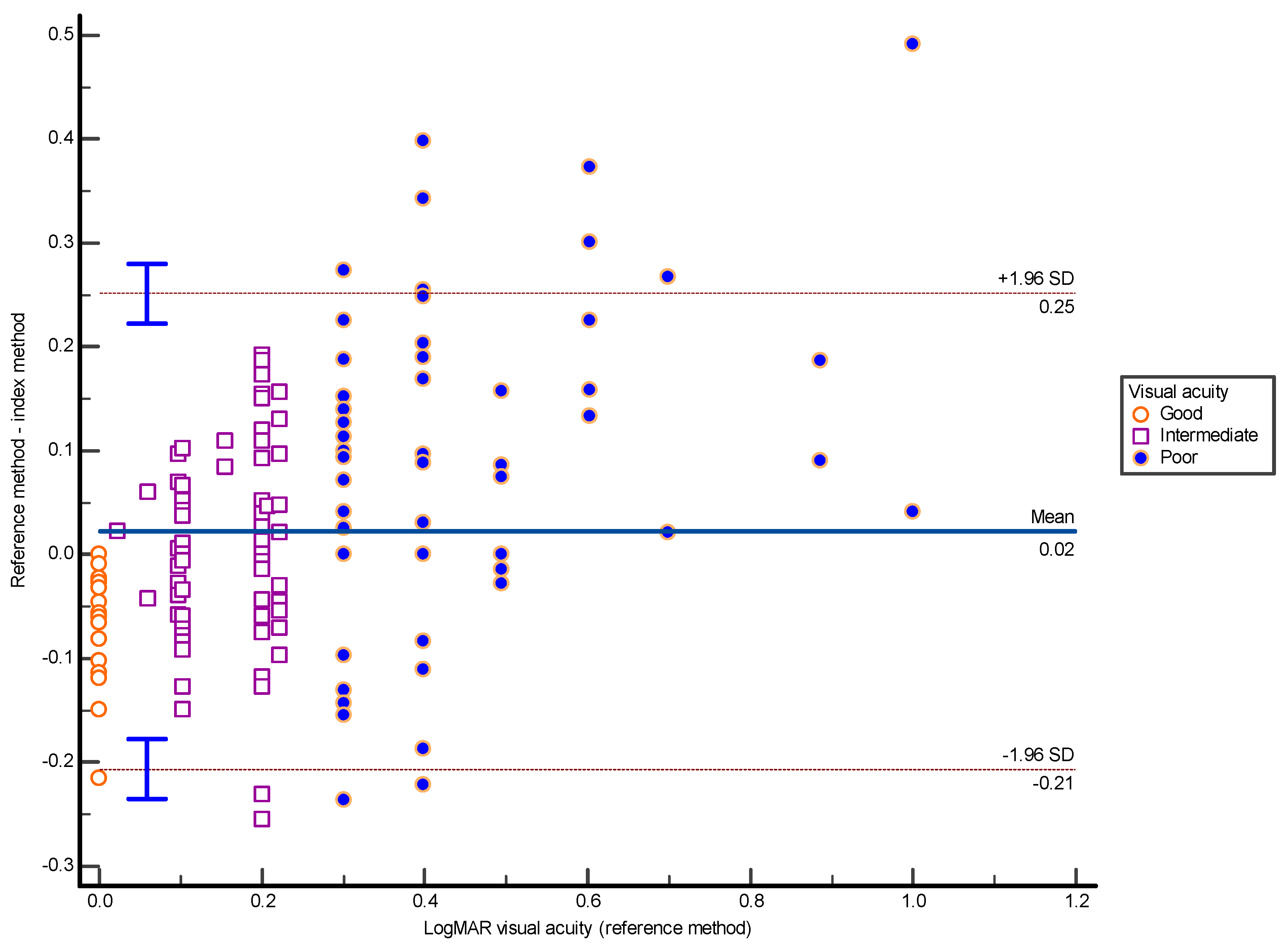 | Good VA reference = 0 | 59 | 0.047 (0.017 to 0.076) | −0.17 (−0.23 to −0.12) | 0.27 (0.22 to 0.32) | 0.00 (0.0); 0.024 (0.049) p = 0.0003 |