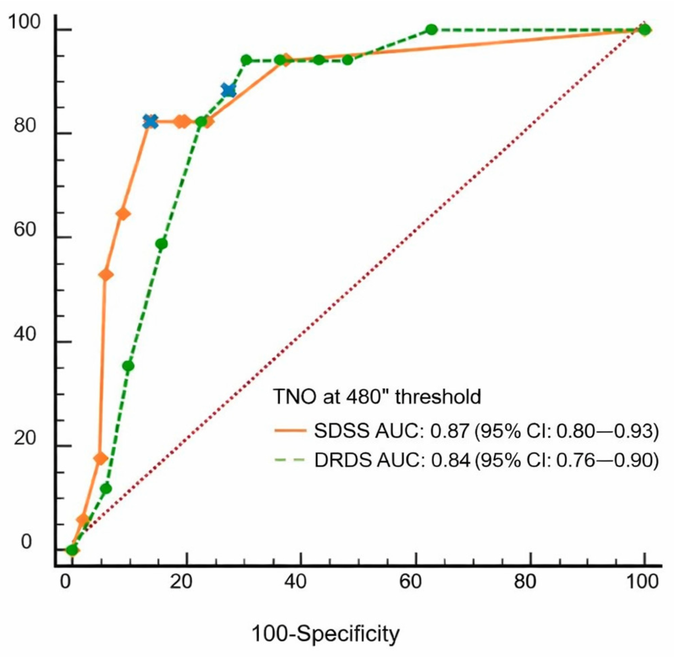- SV outcomes: For the primary analysis, a TNO disparity level of 480″ was selected as the reference threshold, as it corresponds to the upper limit of stereoacuity typically reported in older adults [24,25,26] and showed the best agreement with index test results in our da-taset (see Appendix A). For the index stereotests (SRDS and DRDS), performance was evaluated using a pass–fail criterion defined as correctly identifying at least 5 out of 10 stimuli. This cutoff was selected based on a Bernoulli probability model (p < 0.01), as the probability of achieving ≥5 correct responses by random guessing in a 10-trial format is below 1%.Diagnostic performance of the index tests relative to the TNO-based classification was evaluated using Receiver Operating Characteristic (ROC) analysis, with pass–fail cutoffs optimized for sensitivity. The area under the ROC curve (AUC) and corresponding confidence intervals were calculated.