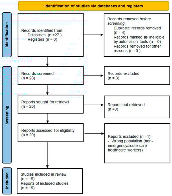 Records were deduplicated and screened at title/abstract level, followed by full-text assessment against prespecified criteria; reasons for full-text exclusion were recorded. Title/abstract screening and full-text assessment were performed independently by two reviewers. Discrepancies were resolved through discussion, with consensus reached in all cases. For the final 2018+ evidence map, records identified (n = 27), duplicates removed (n = 4), records screened (n = 23), excluded at title/abstract (n = 3), full-text assessed (n = 20), full-text excluded (n = 1), and studies included in mapping/synthesis (n = 19). Context-only sources (n = 5) were retained outside PRISMA.