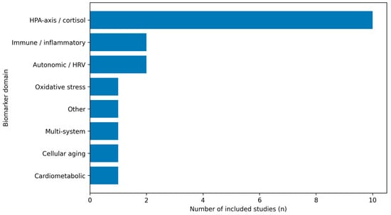 Across included studies, biomarker selection broadly reflects stress-system frameworks, with emphasis on HPA-axis/cortisol dynamics, autonomic regulation (heart rate variability), and immune–inflammatory markers, and less frequent use of oxidative stress, cardiometabolic, cellular aging, or neuroglial candidates. The empirical landscape remains fragmented, however, because studies differ not only in biomarker domain coverage but also—critically—in the timescale indexed by the biomarker endpoint (basal levels, chronic indices, or stress reactivity). We therefore present an evidence map summarizing (i) endpoint classes by biomarker domain (Figure 2), (ii) the distribution of studies across primary biomarker domains (Figure 3), and (iii) study-level details by domain, protocol, and setting (Table 1).