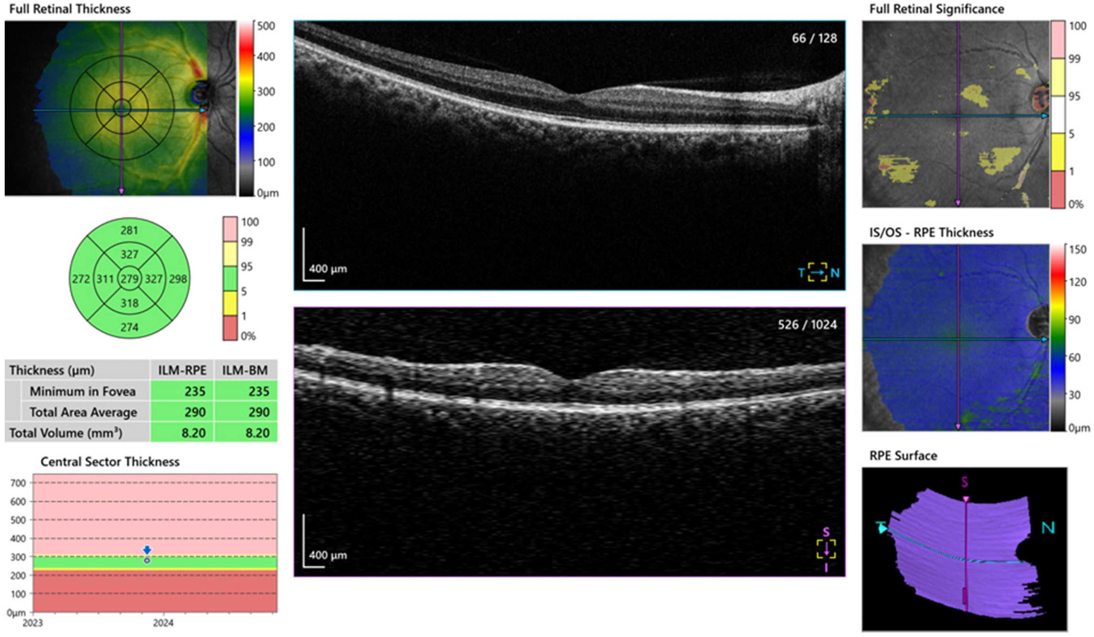 - Boudriot, E.; Schworm, B.; Slapakova, L.; Hanken, K.; Jäger, I.; Stephan, M.; Gabriel, V.; Ioannou, G.; Melcher, J.; Hasanaj, G.; et al. Optical coherence tomography reveals retinal thinning in schizophrenia spectrum disorders. Eur. Arch. Psychiatry Clin. Neurosci. 2023, 273, 575–588. [Google Scholar] [CrossRef]