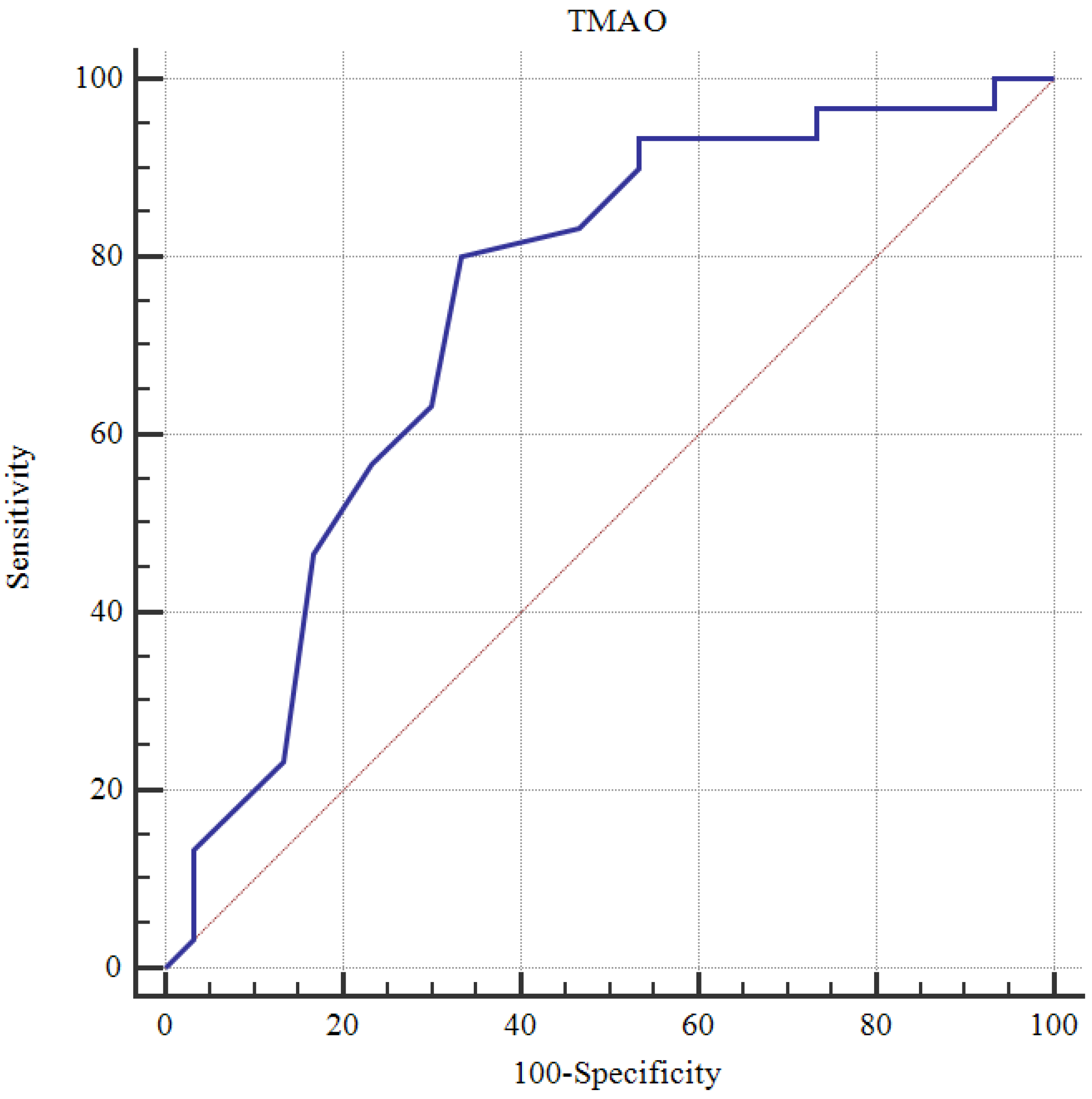 | TMAO ≤ 1.2 | 0.742 | <0.001 | 0.613 | 0.847 | 80 | 66.7 | 70.6 | 76.9 |