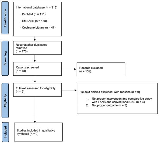 Nine studies were included in the meta-analysis, comprising two randomized controlled trials (RCTs) [10,18] and seven non-randomized (one prospective and six retrospective) [11,12,13,14,15,16,17]. These comparative studies described patients who underwent RIRS using FANS-UAS and conventional UAS for renal or proximal ureteral stones. The included studies were published between September 2023 and March 2025. Among these studies, two were multicenter studies, one was conducted across China, Turkey, Malaysia, and the Philippines [18] and another across Singapore, the United Kingdom, Canada, Saudi Arabia, India, Indonesia, Russia, Hong Kong, Italy, and France [14]. Of the single-center studies, five were conducted in China [11,12,13,16,17], one in Italy [10], and one in Turkey [15]. Characteristics of the nine included studies are presented in Table 1 [10,11,12,13,14,15,16,17,18].
