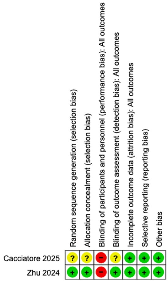 The ROB for the RCTs is shown in Figure 3 and Figure 4. ROB in the included RCTs was evaluated using the Cochrane RoB tool. Two RCTs were included in this assessment [10,18]. Overall, Zhu et al. [18] demonstrated a low ROB across all major domains, whereas Cacciatore et al. [10] showed uncertainty or high risk in several key areas, resulting in comparatively lower methodological quality. Zhu et al. [18] assessed random sequence generation (selection bias) as low risk because of the explicit description of computerized randomization, whereas Cacciatore et al. [10] did not provide sufficient details, leading to an unclear risk rating. Allocation concealment was adequately performed by Zhu et al. [18], but remained unclear in the study by Cacciatore et al. [10]. Both studies exhibited a high risk of performance bias (blinding of participants and personnel), which was expected given the nature of the surgical interventions and the visibility of different UAS devices. However, blinding of the outcome assessment (detection bias) was adequately addressed by Zhu et al. [18] through a blinded radiologic imaging review, whereas Cacciatore et al. [10] did not clearly report the assessor blinding and was rated as unclear. In terms of attrition bias (incomplete outcome data) and reporting bias (selective reporting), both RCTs were rated as low risk, with complete follow-up and consistent reporting of all predefined outcomes. No other sources of bias were identified. The MINORS scores for the non-RCTs are shown in Table 2. Seven non-randomized studies reported total MINORS scores between 17 and 22. This indicates that the overall methodological quality of the included studies was moderate to good. However, nearly all studies lacked prospective data collection. Despite some limitations, the statistical analyses were generally adequate across the studies.