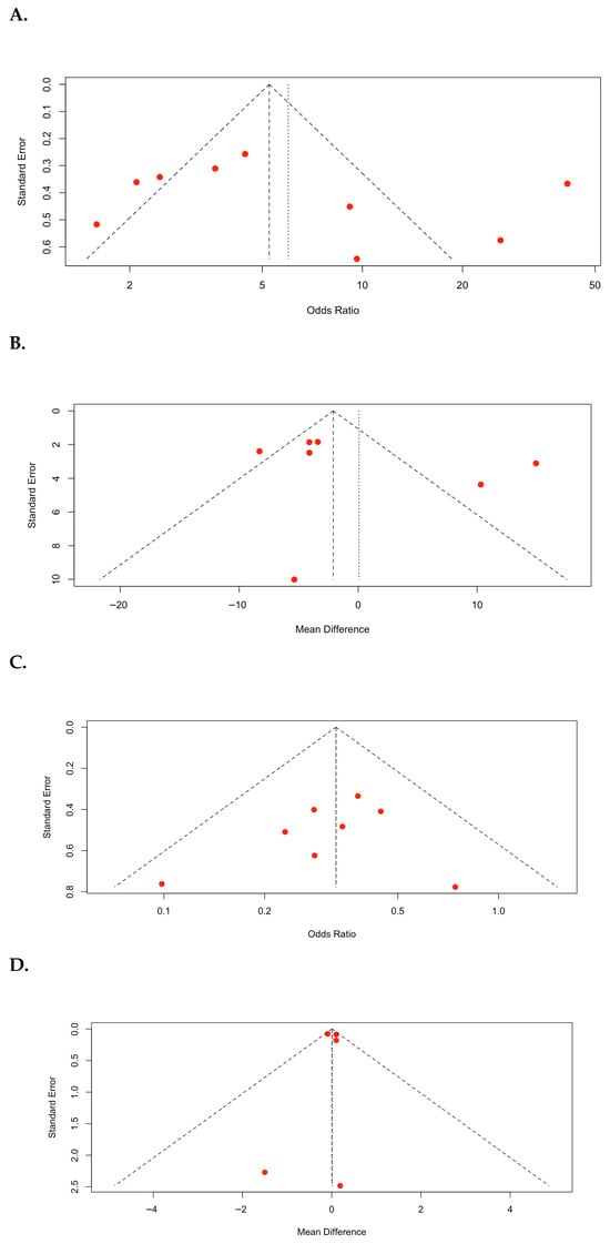 Funnel plots of the meta-analyses are shown in Figure 5. In the SFR (Figure 5A), a visual inspection of the plot revealed a relatively symmetrical distribution of studies around the pooled effect size. However, a small degree of asymmetry was observed, indicating the small effect of the study. However, the overall pattern did not strongly suggest a significant publication bias. Statistical tests for asymmetry (Egger’s regression test: p = 0.4916) were not significant, indicating no evidence of small-study bias. For operative time (Figure 5B), the distribution of studies appeared relatively symmetrical around the pooled MD; although two studies showed a higher MD with a larger standard error, the overall pattern did not demonstrate clear evidence of asymmetry. Statistical tests for asymmetry (Egger’s regression test: p = 0.4916) were not significant, indicating no evidence of small-study bias. For complication rate (Figure 5C), the plot demonstrated a visually symmetrical distribution of studies around the pooled odds ratio. Statistical tests for asymmetry (Egger’s regression test, p = 0.4608) were not significant, implying that publication bias was unlikely to have had a meaningful effect on the pooled estimate of complication rates. During hospital stay (Figure 5D), the plot demonstrated a highly symmetrical distribution of studies around the pooled MD. Most studies clustered near the top of the funnel, indicating relatively small standard errors and high precision. Statistical tests for asymmetry (Egger’s regression test: p = 0.9379) were not significant, indicating no strong evidence of small-study bias.
