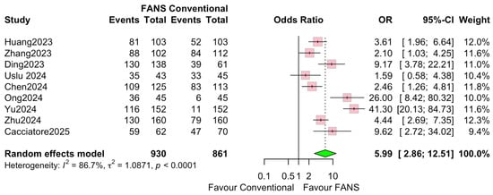 Nine studies involving 1791 patients (930 and 861 in the FANS-UAS and conventional UAS groups, respectively) were included in the meta-analysis evaluating SFR [10,11,12,13,14,15,16,17,18]. As shown in Figure 6, the pooled results using a random-effects model demonstrated that FANS-UAS significantly increased the likelihood of achieving SFR compared with conventional UAS (OR = 5.99, 95% CI = 2.86–12.51, p < 0.0001). Across individual studies, all included datasets favored FANS-UAS. The odds ratio was between 2.10 and 41.30, indicating a consistent benefit across varying surgical settings and populations. No study demonstrated superiority of conventional UAS over FANS-UAS. Substantial inter-study heterogeneity was observed (I2 = 86.7%, τ2 = 1.026), reflecting differences in stone size, surgical technique, imaging modalities used for SFR assessment, surgeon experience, and variations in FANS-UAS device design. Despite this, the overall effect consistently favored FANS-UAS, supporting the robustness of the pooled outcome.