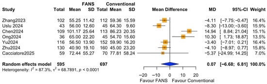 Seven studies comprising 1292 patients (595 and 697 in the FANS-UAS and conventional UAS groups, respectively) reported operative time [10,11,14,15,16,17,18]. Pooled analysis using a random-effects model showed no statistically significant difference in mean operative time between FANS-UAS and conventional UAS (MD = 0.07, 95% CI = −6.68 to 6.81, p = 0.984), as shown in Figure 7. At the individual study level, four studies demonstrated numerically shorter operative times in the FANS-UAS group [10,16,17,18], although only Zhang et al. [17] (MD = −4.11, 95% CI = −7.75 to −0.47) reached statistical significance. In contrast, Chen et al. and Ong et al. [11,14] reported significantly longer operative times in the FANS-UAS group (MD = 14.94, 95% CI = 8.84–21.04; MD = 10.30, 95% CI = 1.73–18.87). There was substantial heterogeneity across the included studies (I2 = 87.3%, τ2 = 66.68, p < 0.0001), likely attributable to differences in stone burden, laser settings, suction system design, surgeon experience, and surgical strategies.