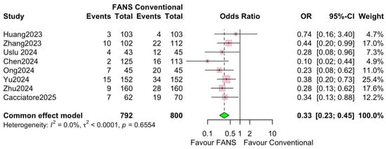 Eight studies, involving 1592 patients (792 and 800 in the FANS-UAS and conventional UAS groups, respectively), reported postoperative complication rates [10,11,13,14,15,16,17,18]. As shown in Figure 8, the pooled analysis using a common effects model demonstrated that FANS-UAS was associated with a significantly lower risk of complications compared with conventional UAS (OR = 0.33, 95% CI = 0.23–0.45, p < 0.0001). Across individual studies, seven of eight trials favored FANS-UAS, with ORs consistently below 1.0. No study reported higher complication rates in the FANS-UAS group. The most reported complications were Clavien–Dindo grades I–II, which included fever, hematuria, transient pain, or infection. No significant heterogeneity was detected (I2 = 0.0%, p = 0.6554), indicating strong consistency among the included studies, despite differences in study design, surgeon experience, and FANS-UAS device type.
