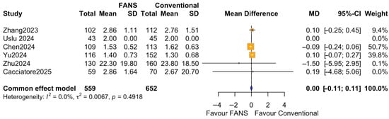 Six studies (1211 patients), comprising 559 patients in the FANS-UAS group and 652 patients in the conventional UAS group, reported the duration of postoperative hospital stay [10,11,15,16,17,18]. As shown in Figure 9, the pooled analysis using a common effect model revealed no significant difference in hospital stay between FANS-UAS and conventional UAS (MD = 0.00, 95% CI = −0.11 to 0.11, p = 0.9604). None of the included studies demonstrated a statistically significant difference in length of stay at the individual level. Heterogeneity was negligible (I2 = 0.0%, p = 0.5234), indicating high consistency among study results.