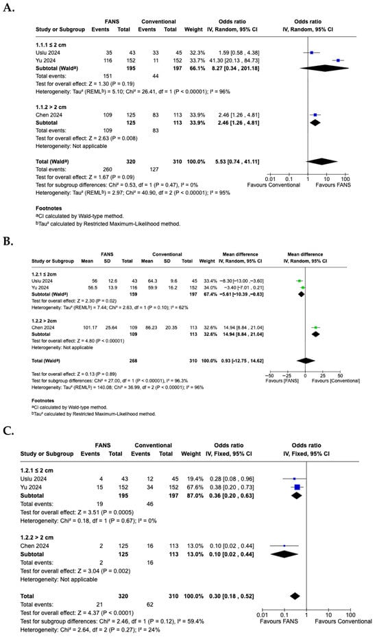 A subgroup analysis based on stone size was performed to evaluate differences in efficacy and safety between FANS-UAS and conventional UAS. For the SFR (Figure 10A), the subgroup of studies with stones ≤2 cm demonstrated no significant difference between FANS-UAS and conventional UAS (OR = 8.27, 95% CI = 0.34–201.18, p = 0.19), with substantial heterogeneity (I2 = 96%) [15,16]. In contrast, the study involving stones >2 cm showed a significantly higher stone-free rate in the FANS-UAS group (OR = 2.46, 95% CI = 1.26–4.81, p = 0.008) [11]. These findings suggest that FANS-UAS may provide greater benefit in cases with larger stone burdens. For operative time (Figure 10B), the subgroup of studies with stones ≤2 cm showed a significantly shorter operative time in the FANS-UAS group (MD = −5.61, 95% CI = −10.39 to −0.83, p = 0.02). In contrast, the study involving stones >2 cm showed a significantly longer operative time in the FANS-UAS group (MD = 14.94, 95% CI = 8.84 to 21.04, p < 0.001) [11]. For complication rate (Figure 10C), FANS-UAS was associated with significantly fewer complications compared with conventional UAS for stones ≤2 cm (OR = 0.36, 95% CI = 0.20–0.63, p = 0.0005; I2 = 0%) [15,16]. Similarly, in the >2 cm subgroup, FANS-UAS demonstrated a substantial reduction in complications (OR = 0.10, 95% CI = 0.02–0.44, p = 0.002) [11]. For hospital stay (Figure 10D), there was no significant difference between FANS-UAS and conventional UAS in both subgroups, including stones ≤2 cm as well as those >2 cm. However, this interpretation should be approached with caution, as the subgroup representing stones >2 cm was based on a single study [11], limiting the generalizability of this result.