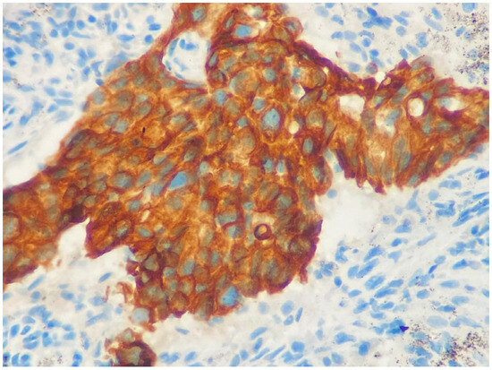 During HER-3 immunohistochemical staining evaluation, both positive and negative controls were taken into account. Staining in more than 30% of tumor cells was considered positive, consistent with the positivity threshold applied in previously published immunohistochemical studies evaluating HER3 expression in NSCLC [20,22]. Evaluation was based on membranous staining intensity. Weak membranous staining was scored as 1, complete but moderate membrane staining was scored as 2, and complete and strong staining was scored as 3 (Figure 1 and Figure 2). HER3 immunohistochemical evaluation was performed by two experienced pathologists with expertise in thoracic pathology at our center. The staining results were independently reviewed and scored according to predefined criteria, and any discrepancies were resolved by consensus. Formal interobserver agreement was not statistically assessed, which represents a limitation of the study.