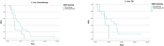 The median PFS1 was 5.2 months. In patients receiving chemotherapy, PFS1 was 4.1 months in HER3-negative patients and 2.5 months in HER3-positive patients (p = 0.063), a difference that did not reach statistical significance. In patients receiving TKI, PFS1 was 14 months in HER3-negative patients and 7.1 months in HER3-positive patients (p = 0.285); this difference likewise did not reach statistical significance (Table 2) (Figure 3).