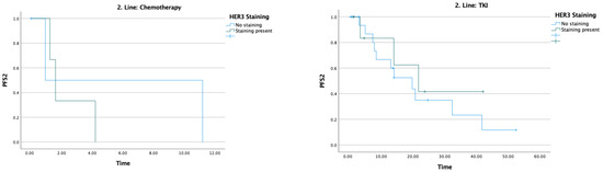 The median PFS2 was 14 months. In patients receiving chemotherapy, PFS2 was 0.9 months in HER3-negative patients and 1.6 months in HER3-positive patients; these notably short values likely reflect the heavily pretreated nature of this subgroup, the small number of patients in each arm, and the real-world setting of the cohort, where performance status and available treatment options may have been more limited. In patients receiving TKI, PFS2 was 19.8 months in HER3-negative patients and 21.8 months in HER3-positive patients (Table 3) (Figure 4).