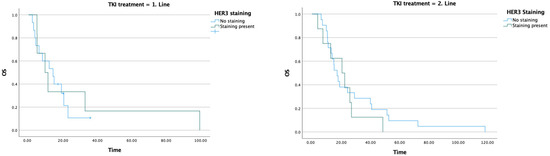 Relationship between TKI treatment line, HER3 staining status, and overall survival.