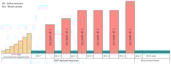 A standardized warm-up was completed before exercise testing, consisting of light aerobic activity and dynamic mobility exercises to prepare the cardiovascular and musculoskeletal systems for the subsequent workload. The exercise protocol comprised a stepwise incremental treadmill CPET performed in 3-min stages, consistent with established CPET methodology for ventilatory-threshold assessment and breath-by-breath interpretation [27]. Running began at 6.5 km·h−1 and increased by 0.7 km·h−1 per stage. The incremental phase was terminated when participants reached a respiratory exchange ratio (RER) of 1.00 and/or a blood lactate (BLa) concentration of 4.0 mmol·L−1, using a pragmatic operational criterion based on the fixed 4-mmol·L−1 lactate threshold concept [28]. This strategy was implemented to standardize the endpoint of the incremental phase and to avoid a fully maximal test before the subsequent intermittent bout sequence. In addition, the second ventilatory threshold (VT2) was identified using combined CPET criteria, including a sustained increase in ventilatory equivalents (particularly VE/VCO2) together with a concurrent decrease in end-tidal CO2 (PetCO2) [29]. In addition, VT2 was identified using combined CPET criteria, including a sustained increase in ventilatory equivalents (particularly VE/VCO2), together with a concurrent decrease in end-tidal CO2 (PetCO2). Immediately thereafter, participants completed 3 min of active recovery, followed by an intermittent running protocol consisting of six (n = 6) 60-s high-speed bouts interspersed with 60-s of recovery. Intermittent running intensity was prescribed relative to the VT2-derived running speed, with successive stages set at 120% (1 repetition), 140% (1 repetition), 160% (3 repetitions), and 180% (1 repetition) of this reference speed; each 60-s bout was separated by a 60-s active recovery (AR) interval, denoted AR1–AR6, and the protocol concluded with an 8-min active recovery, as detailed in Figure 1.