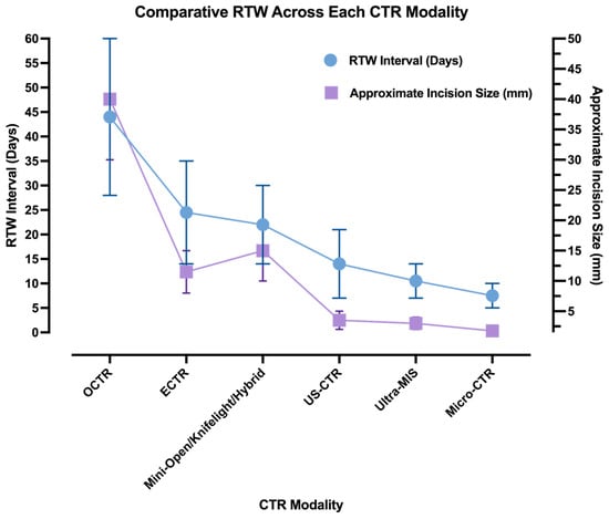 Comparative RTW intervals reported across major CTR modalities. Data derived from multicentre and randomised studies demonstrating reduction in median RTW durations in cohorts undergoing less invasive procedures.