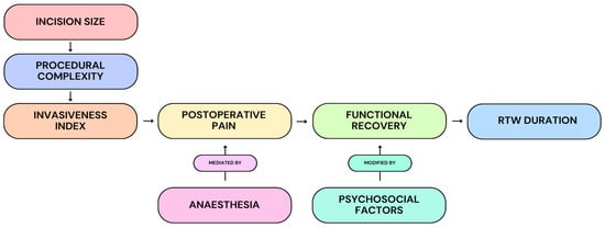 Conceptual model illustrating the proposed relationship between incision size, procedural complexity, and representative invasiveness to postoperative pain, functional recovery, and ultimately RTW duration. Anaesthesia is depicted as a mediator of postoperative pain, while psychosocial factors are shown as modifiers of recovery trajectories. This framework contextualises how procedural design may influence functional and socioeconomic outcomes within the observational literature.