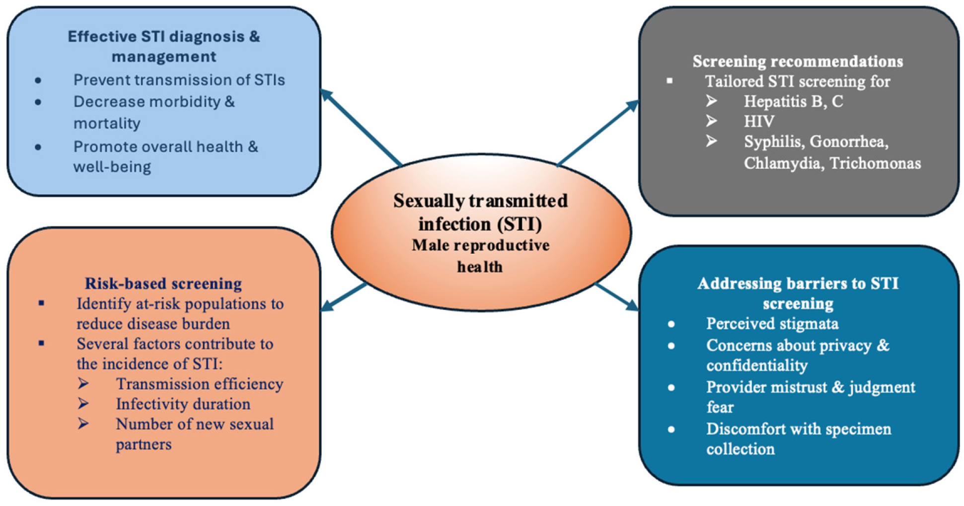 - Kuunibe, J.K.; Apiribu, F.; Laari, T.T.; Atanuriba, G.A.; Dzomeku, V.M.; Bam, V.B.; Diji, A.K.A.; Mensah, A.B.B.; Amooba, P.A.; Mohammed, R.S.; et al. Exploring the Barriers to Clinic-based Screening for Sexually Transmitted Infections (STIs) among Men in Ghana: A Qualitative Study. J. Community Med. Health Solut. 2024, 5, 44–51. [Google Scholar] [CrossRef]
