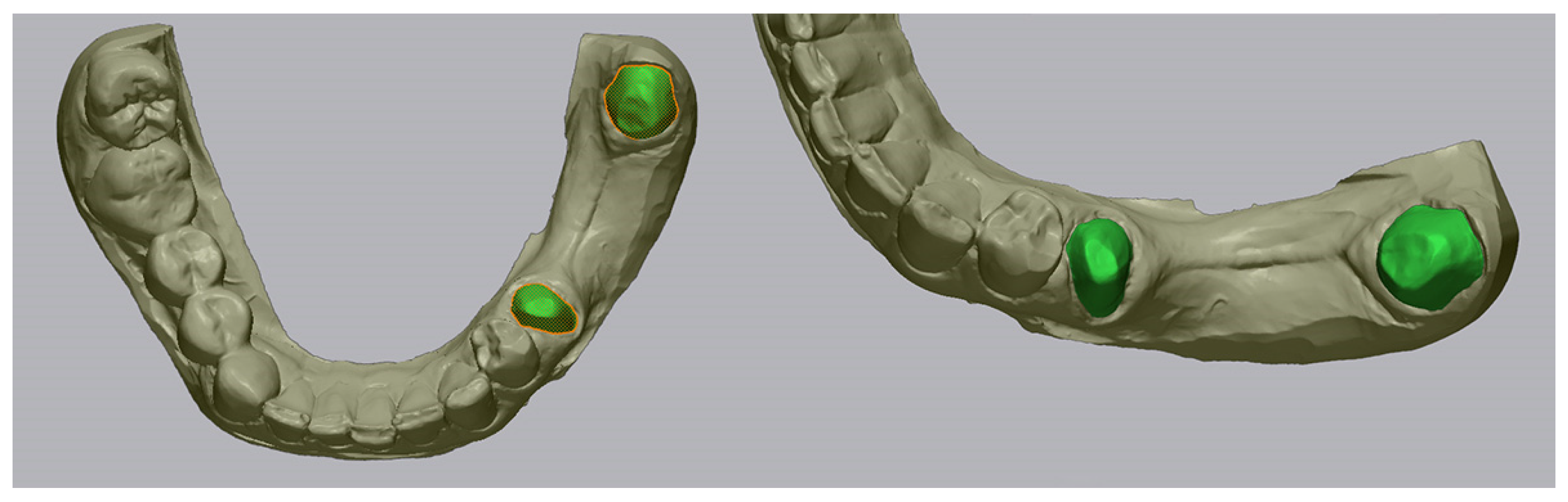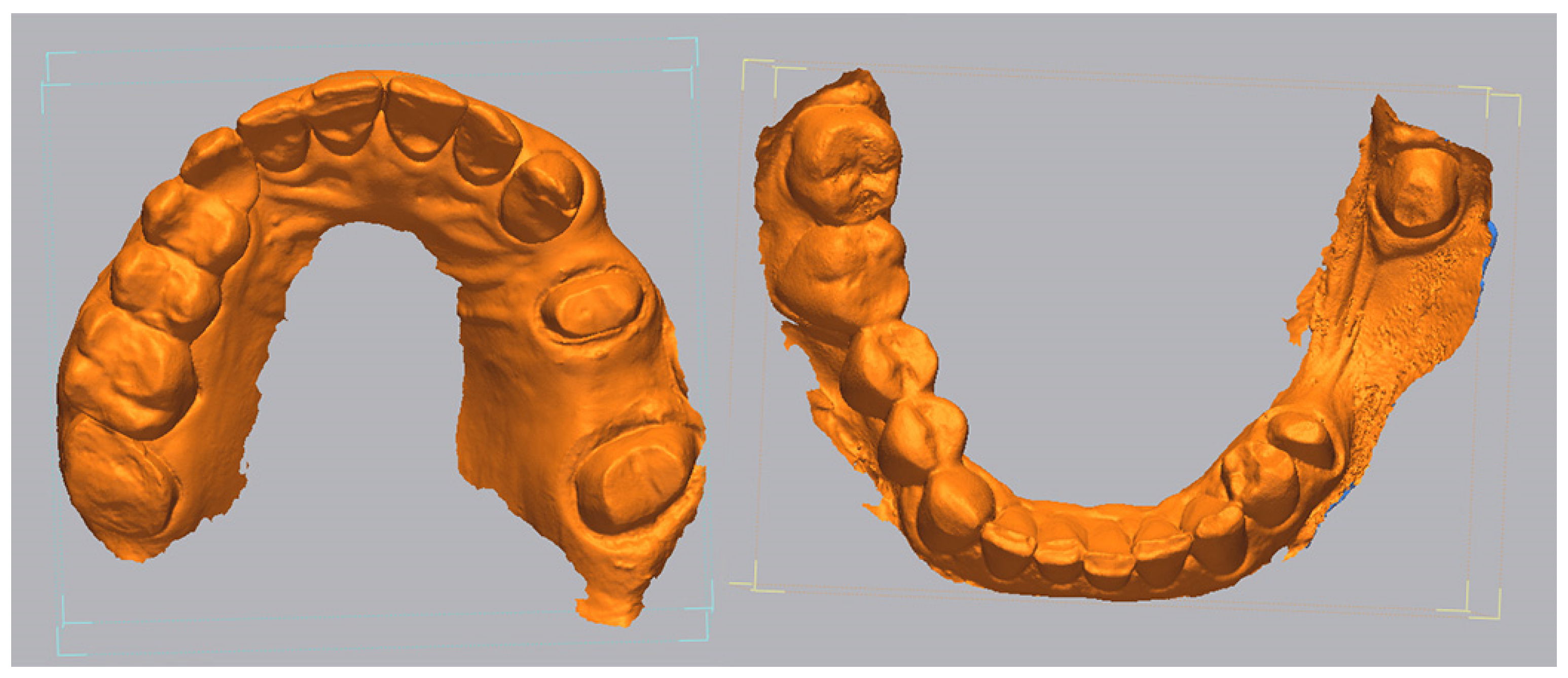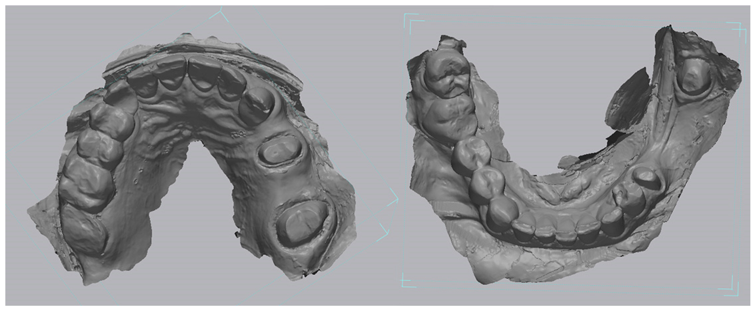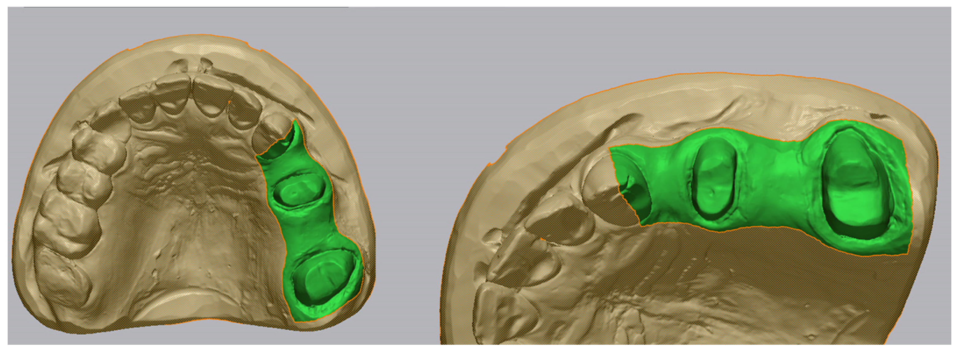 For the lower jaw, the area of interest was limited exclusively to the prepared surfaces of abutment teeth 3.5 and 3.8, excluding adjacent teeth and mucosa (