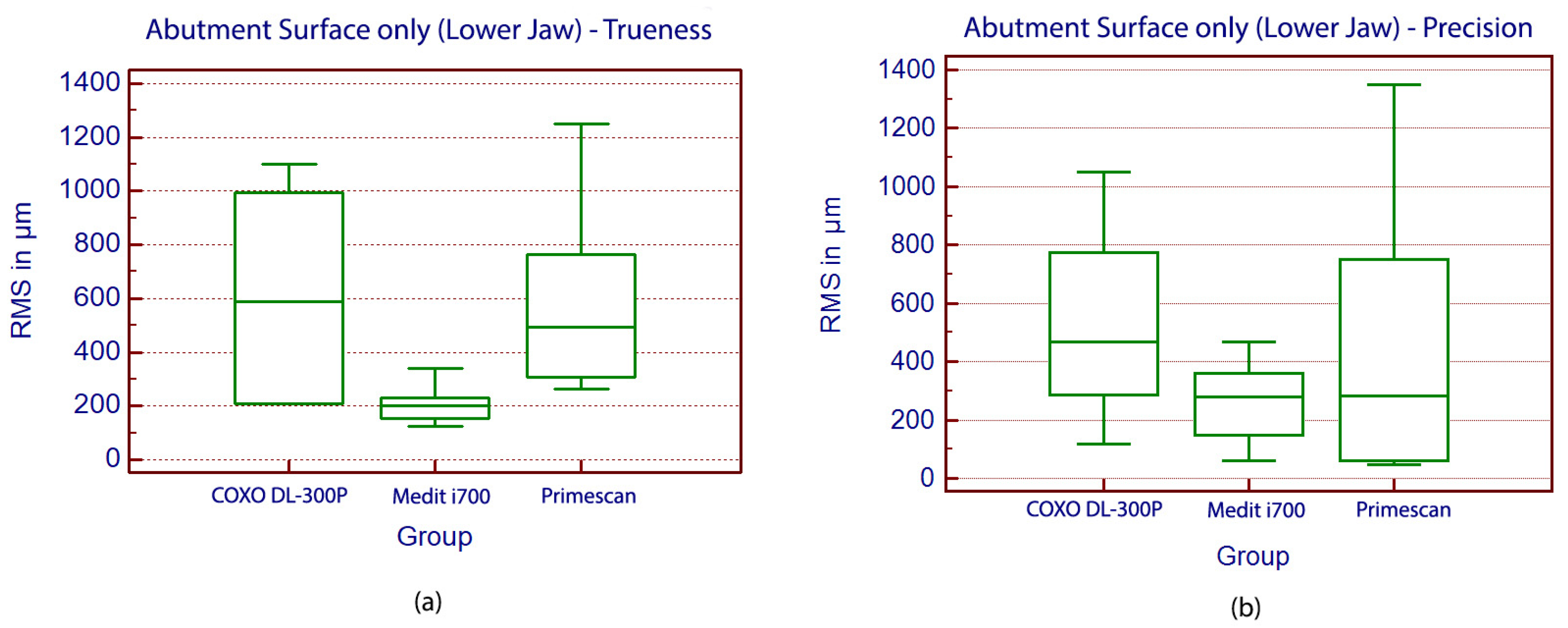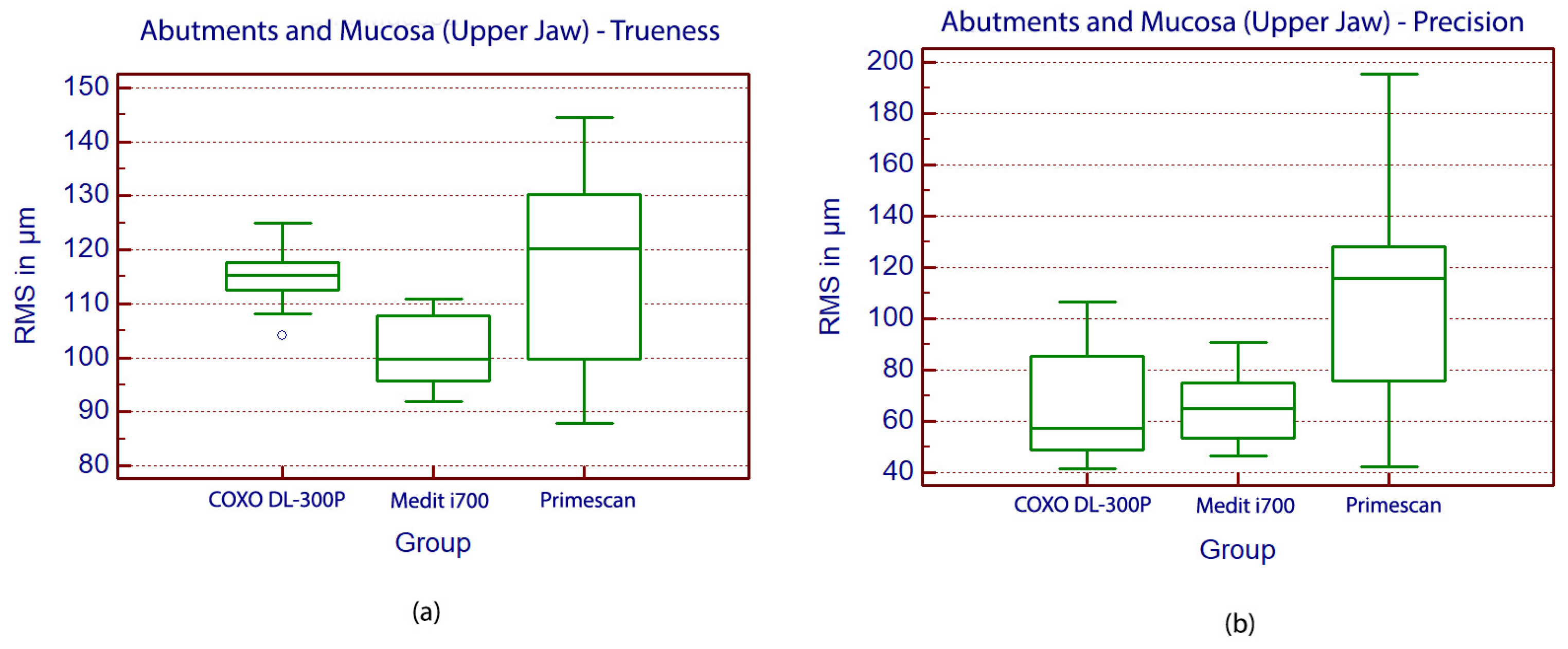All trueness and precision values obtained from the 3D deviation analysis were exported into MedCalc Statistical Software (Version 20.218, MedCalc Software Ltd., Ostend, Belgium) for further statistical evaluation. Data were analyzed separately for the upper jaw (abutments and mucosa) and lower jaw (abutment surfaces only).