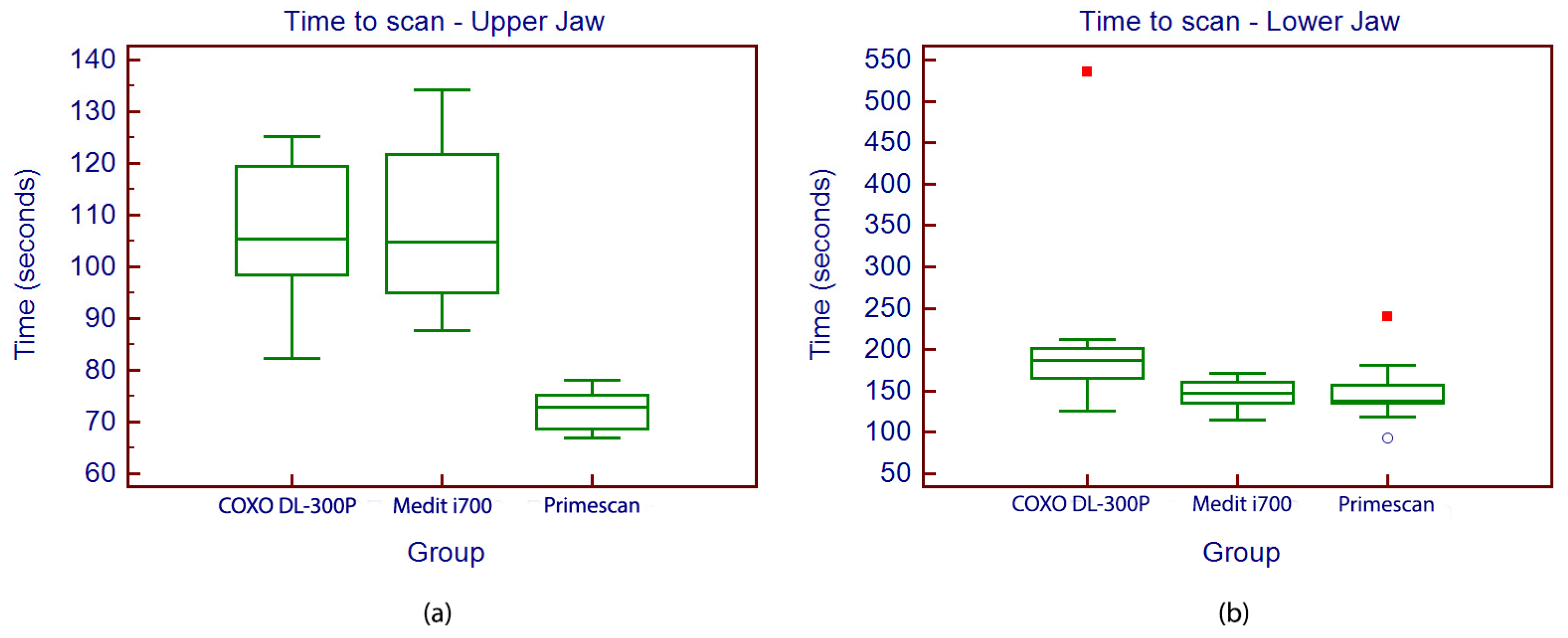 p = 0.068). Primescan 1 achieved the shortest average time (144.3 ± 37.4 s), closely followed by an insignificant difference by Medit i700 (144.8 ± 17.2 s), while COXO DL-300P required 195.5 ± 109.9 s (