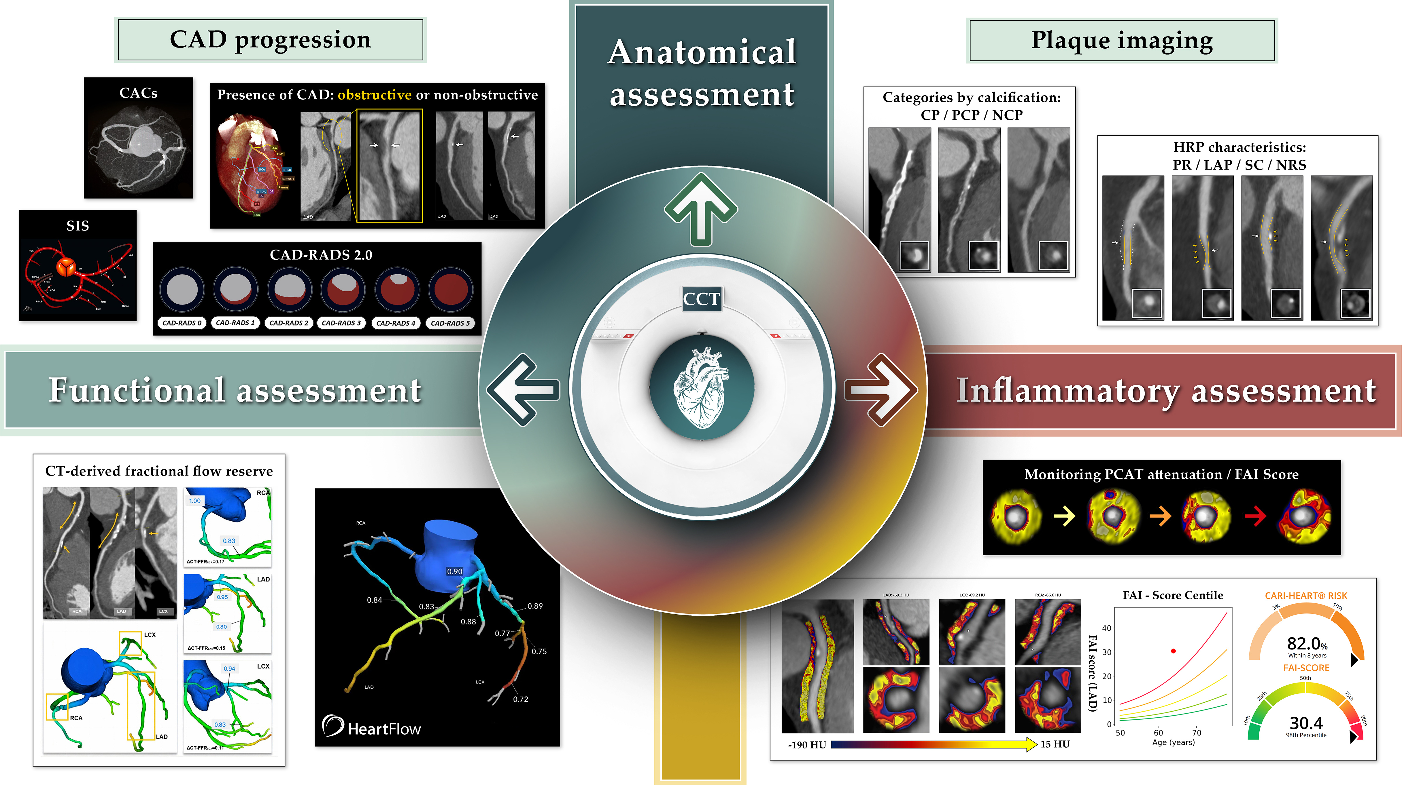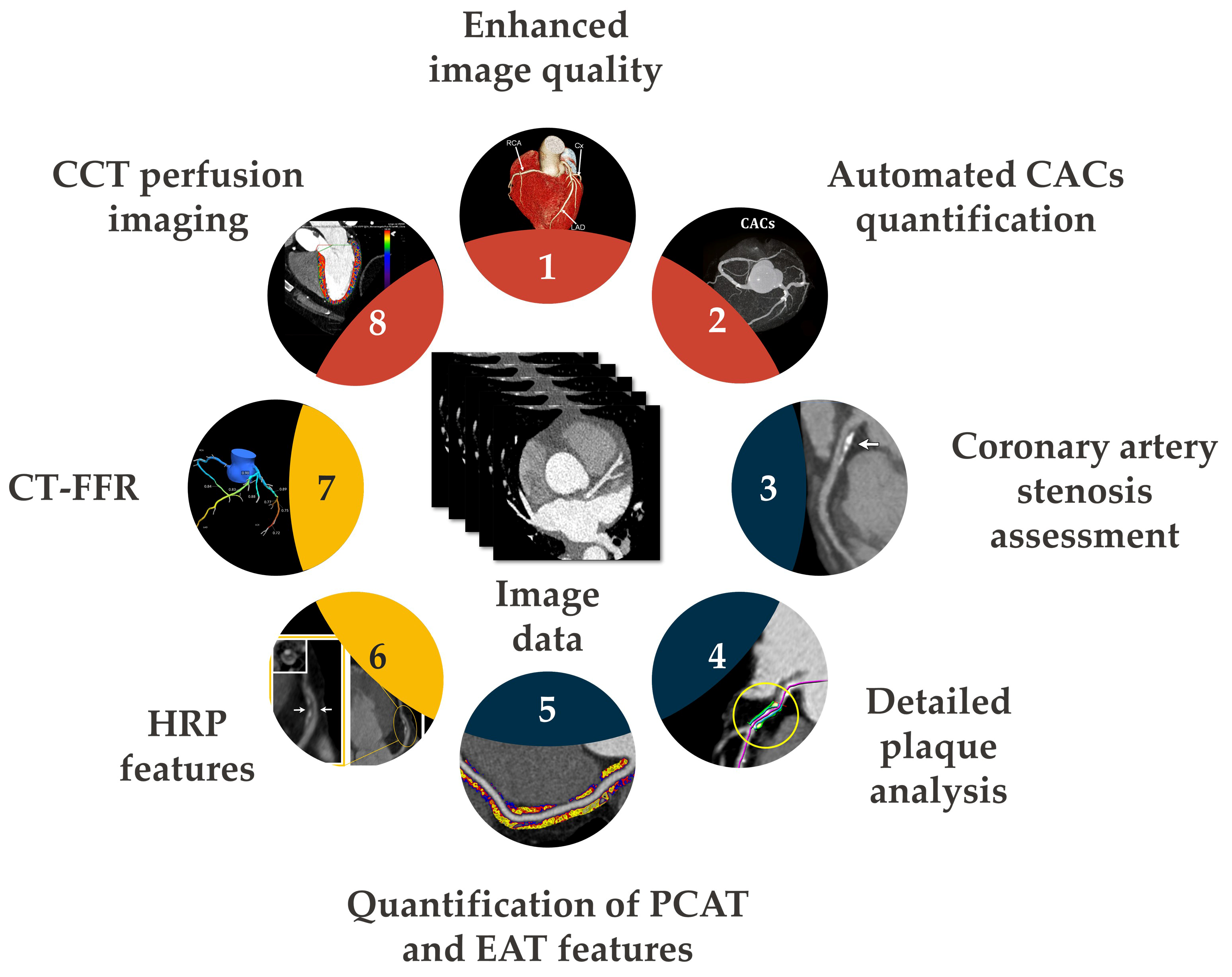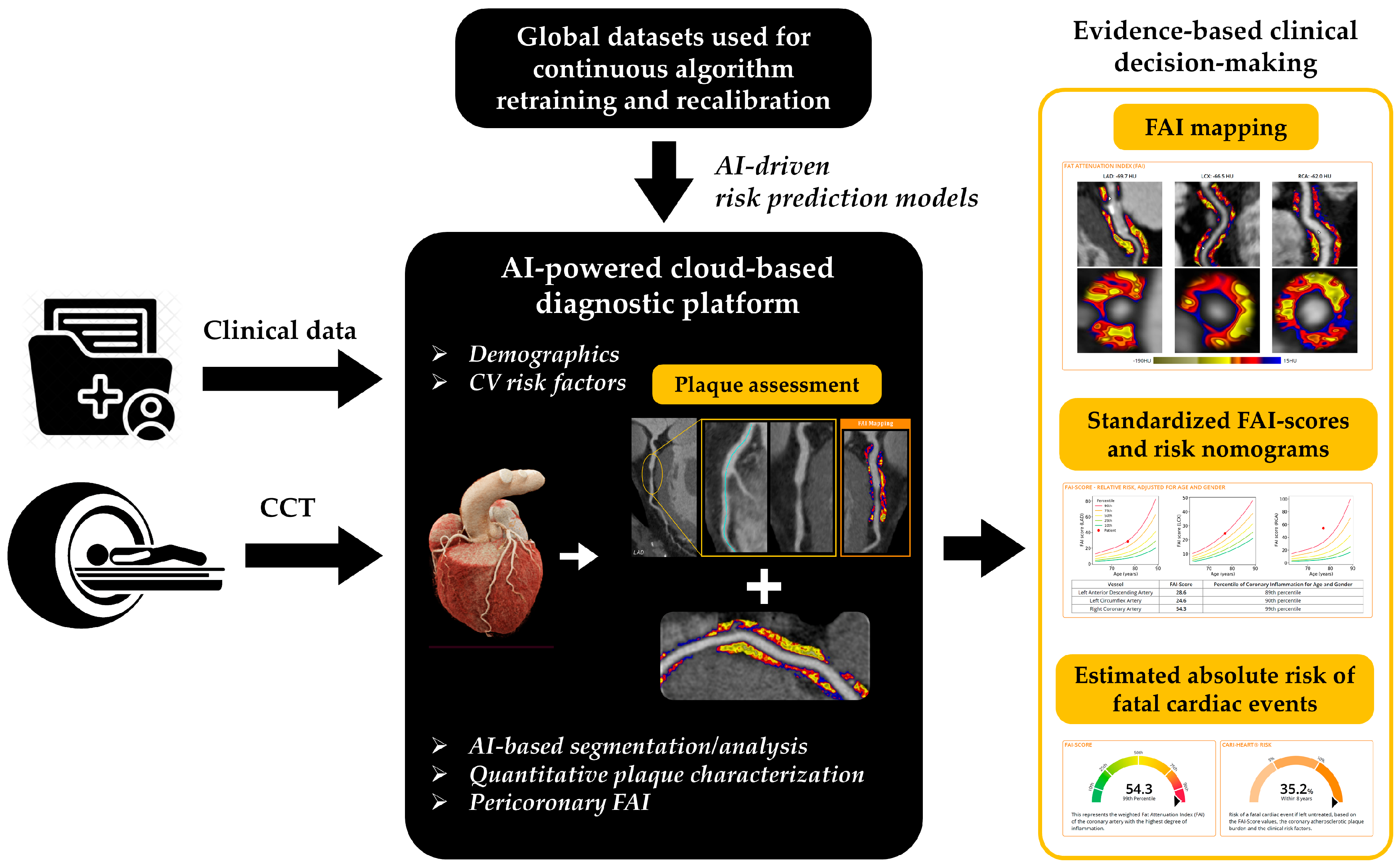 While advances in cardiac computed tomography (CCT) have strengthened non-invasive evaluation of coronary artery disease (CAD) [5,6,7], reliance on luminal stenosis alone is insufficient, as many acute coronary syndromes (ACS) originate from non-obstructive yet highly inflamed plaques [8,9,10]. Emerging evidence positions vascular inflammation as a central driver of plaque vulnerability, highlighting the need for biologically informed imaging. Radiomic assessment of pericoronary adipose tissue (PCAT), particularly through the fat attenuation index (FAI), offers a sensitive marker of local inflammatory activity that complements anatomical characterization [11,12,13]. Combined with innovations such as CT-derived fractional flow reserve (CT-FFR) and AI-enabled risk platforms, CCT is transitioning from solely an anatomical tool to a modality capable of capturing dynamic aspects of plaque biology, enabling improved risk stratification and personalized prevention strategies [14,15,16,17,18]. Although PCAT-derived biomarkers have demonstrated strong prognostic associations in observational cohorts, their integration into routine clinical pathways remains under investigation.