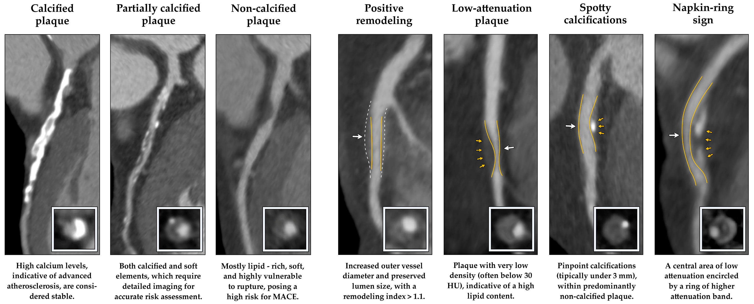 Beyond morphologic classification, CCT enables identification of a series of imaging signatures that reflect underlying plaque biology and instability. These so-called high-risk plaque (HRP) markers include positive remodeling (PR), low-attenuation plaque (LAP), spotty calcifications (SC), and the napkin-ring sign (NRS), as shown in Figure 1. PR—defined as a remodeling index > 1.1—suggests compensatory vessel expansion in response to inflammation. LAP, characterized by attenuation < 30 HU, corresponds to lipid-laden necrotic cores, whereas SC represents small punctate calcifications (<3 mm) scattered within the plaque. The NRS, a circumferential high-attenuation rim surrounding a low-attenuation core, is particularly specific for TCFA and has consistently been associated with impending plaque rupture [37,38,39].