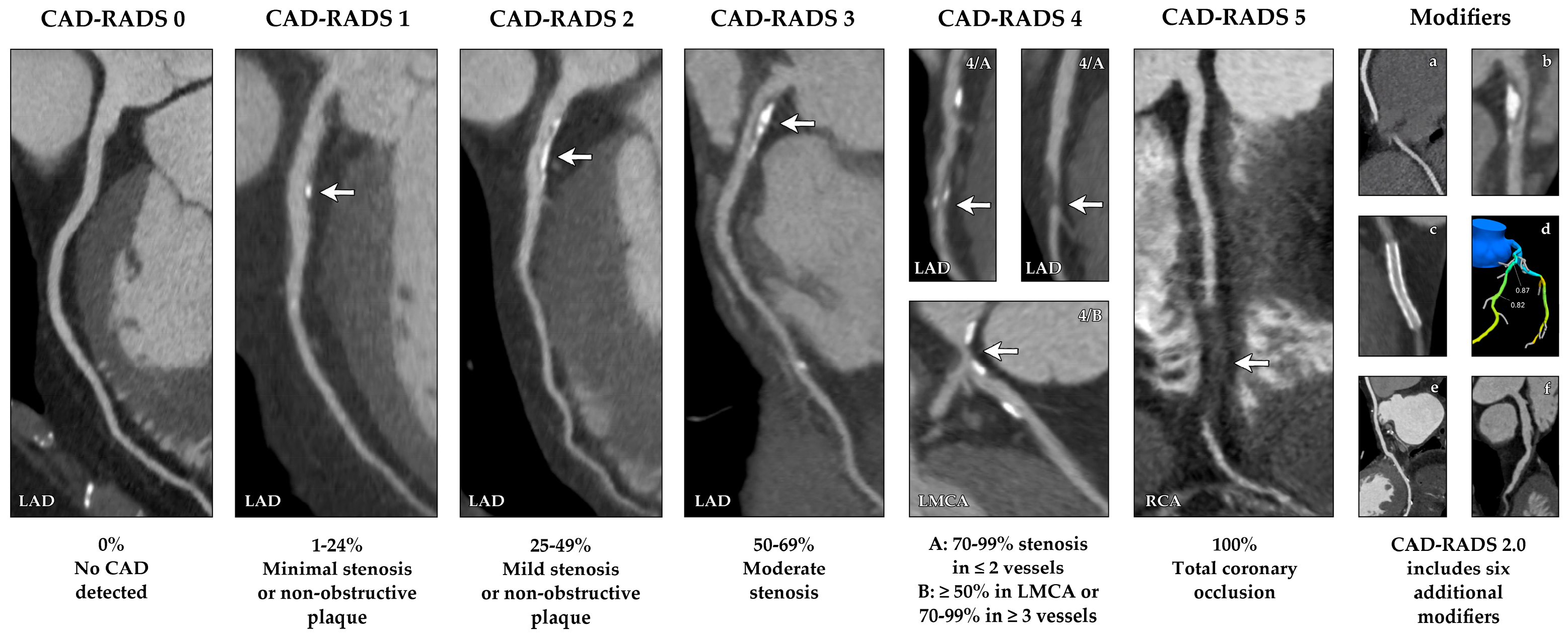 96. Canan, A.; Ranganath, P.; Goerne, H.; Abbara, S.; Landeras, L.; Rajiah, P. CAD-RADS: Pushing the Limits. RadioGraphics 2020, 40, 629–652. [Google Scholar] [CrossRef] [PubMed]