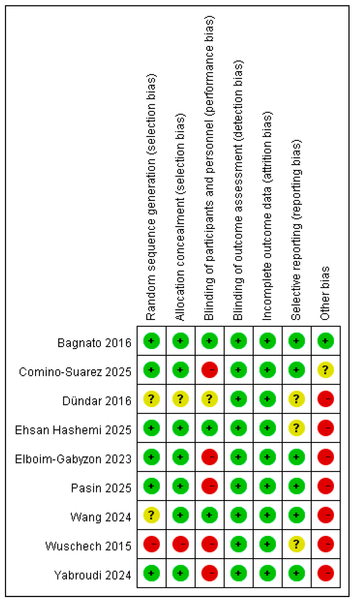 - Sterne, J.A.C.; Savović, J.; Page, M.J.; Elbers, R.G.; Blencowe, N.S.; Boutron, I.; Cates, C.J.; Cheng, H.Y.; Corbett, M.S.; Eldridge, S.M.; et al. RoB 2: A revised tool for assessing risk of bias in randomised trials. BMJ 2019, 366, l4898. [Google Scholar] [CrossRef]