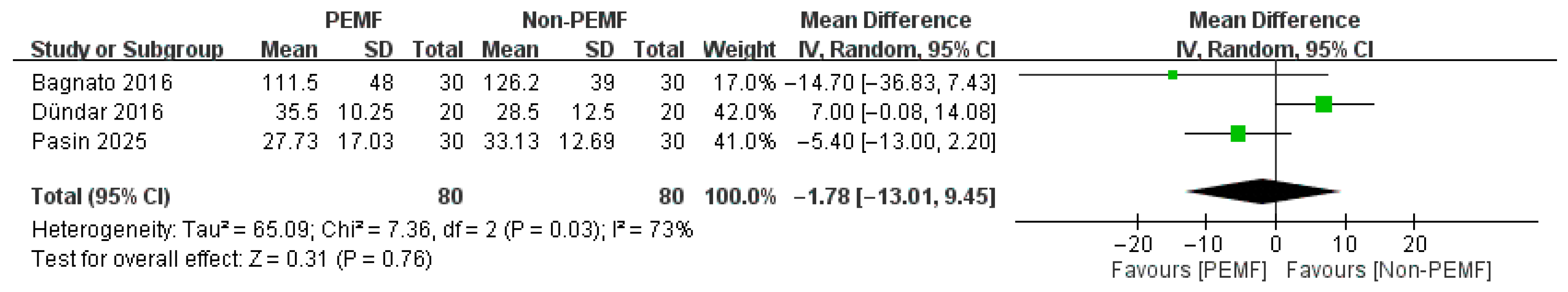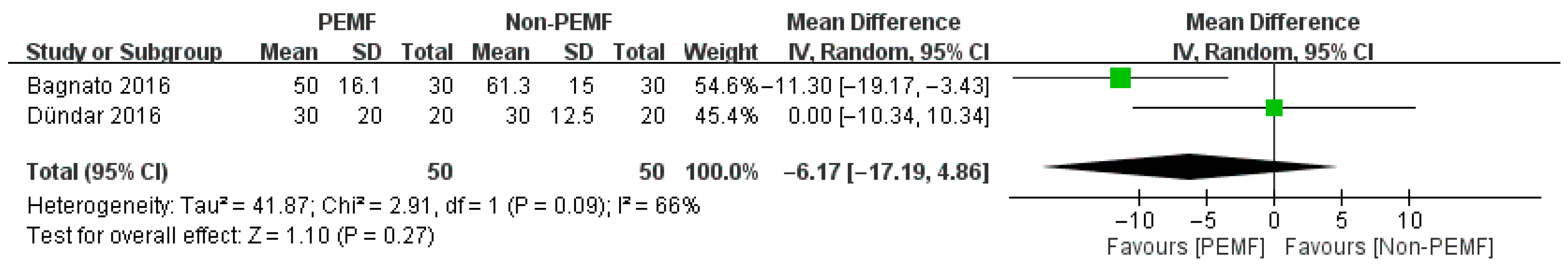 | Dündar, 2016 [29] | 20/20 | 0.1 mT/50 Hz | VAS pain score (0–100) |