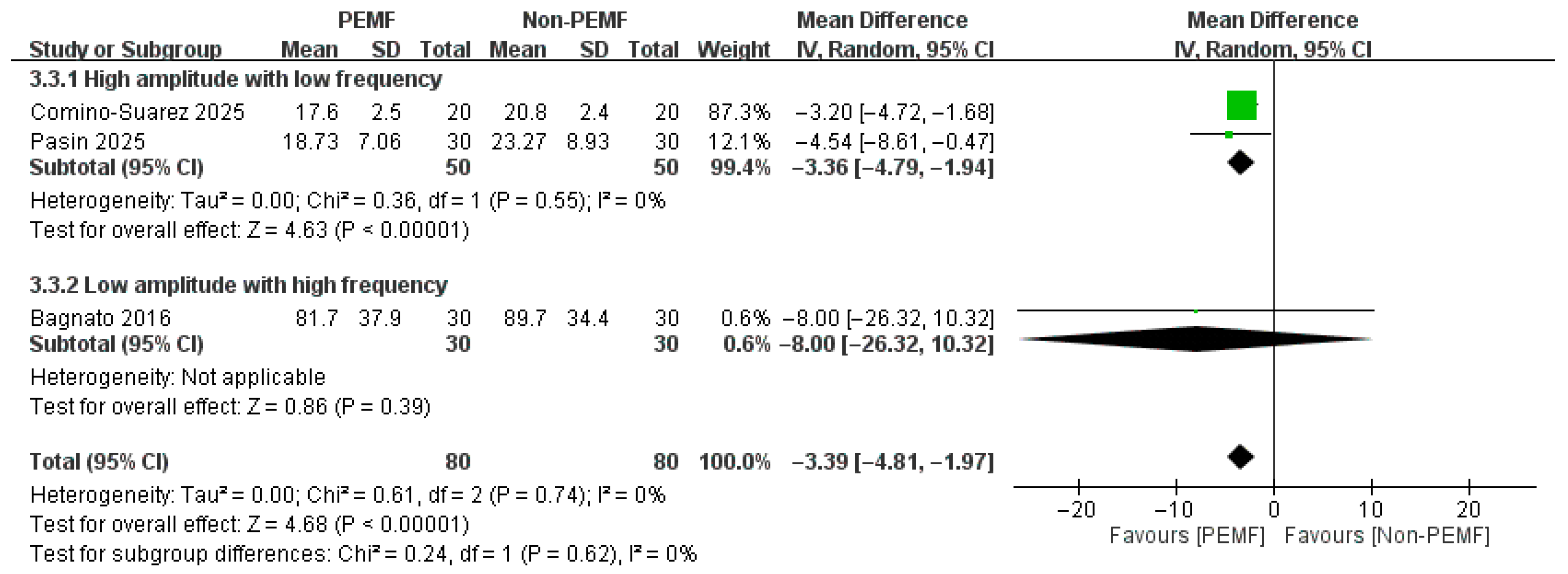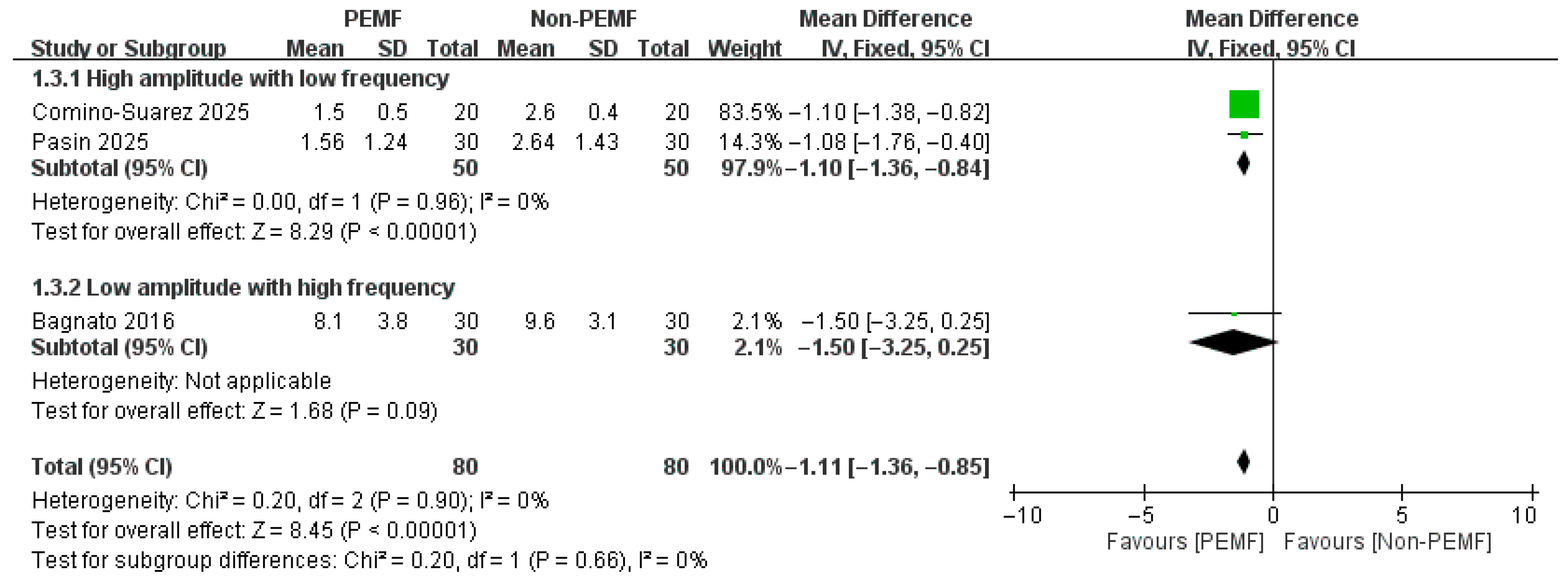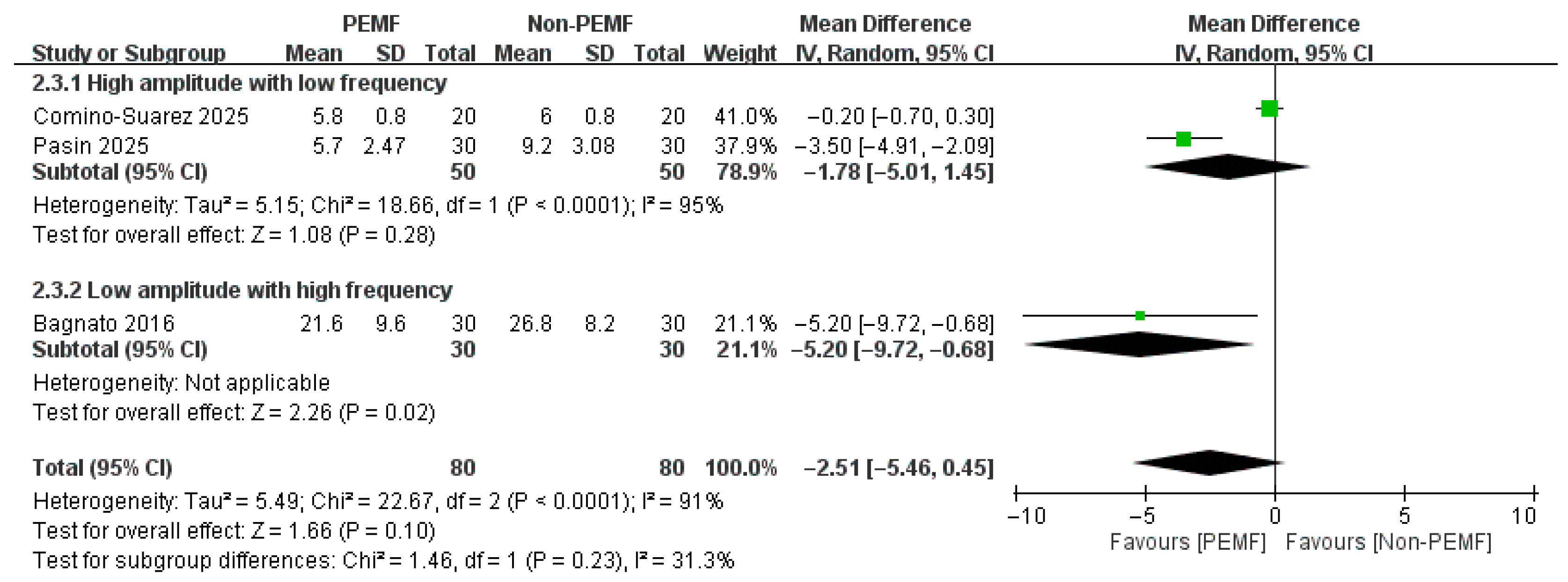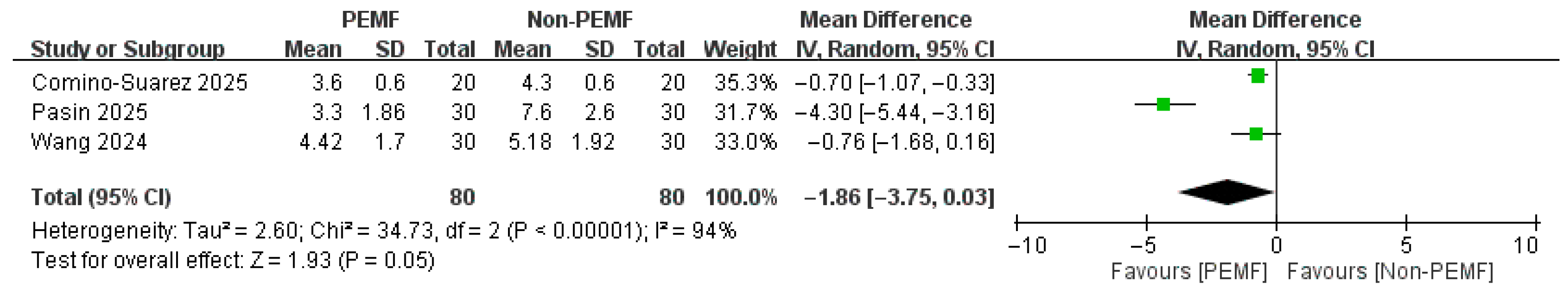 | Wang, 2024 [23] | 30/30 | 1 mT/50 Hz | VAS pain score (0–10), FTSST |
