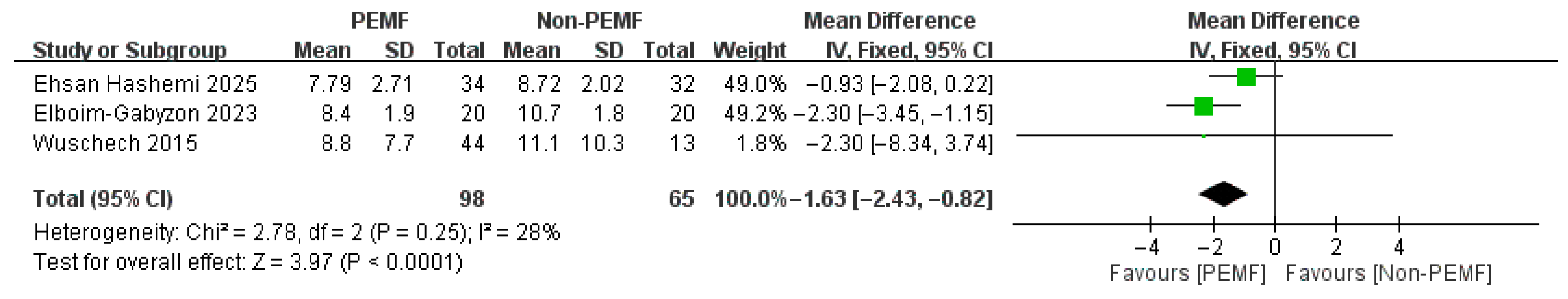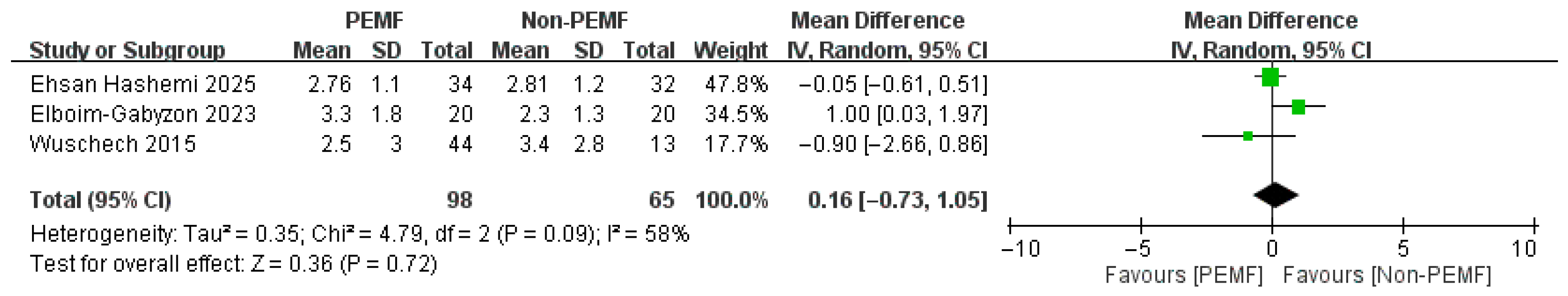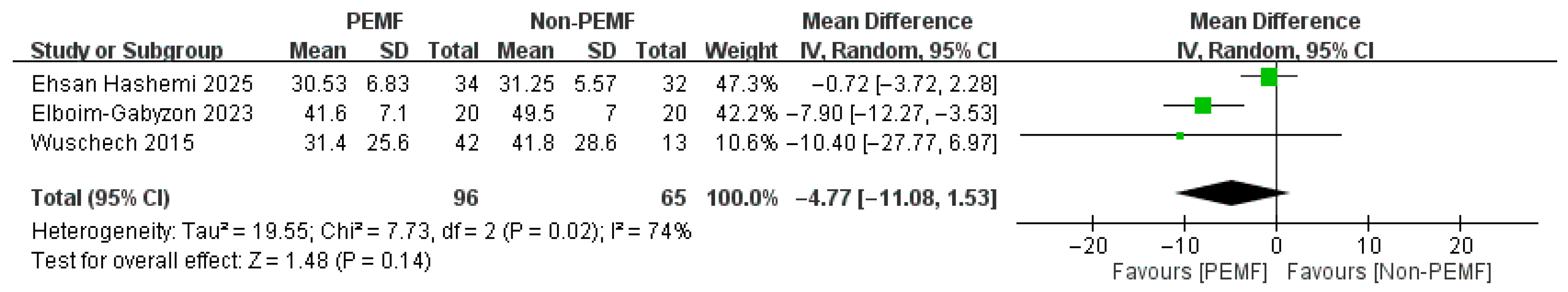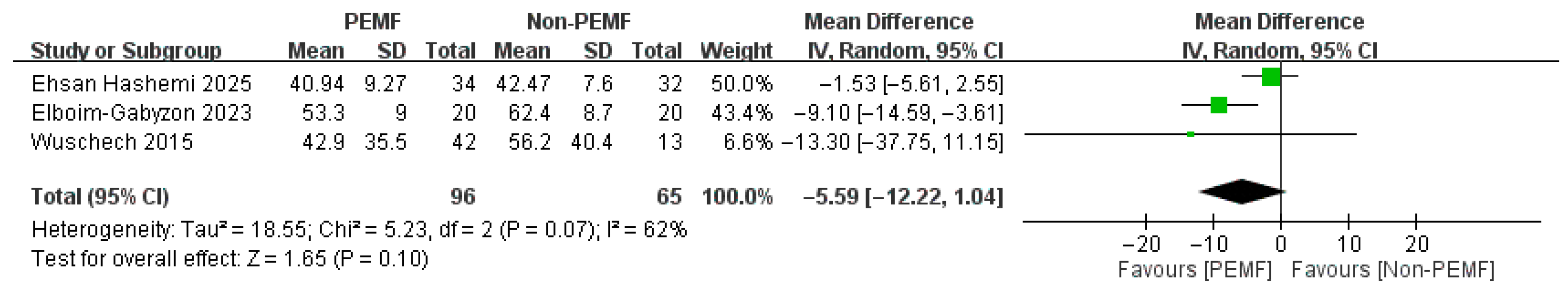 | Ehsan Hashemi, 2025 [34] | 34/32 | 1.2 mT/10–100 Hz | WOMAC, VAS pain score (0–100) |