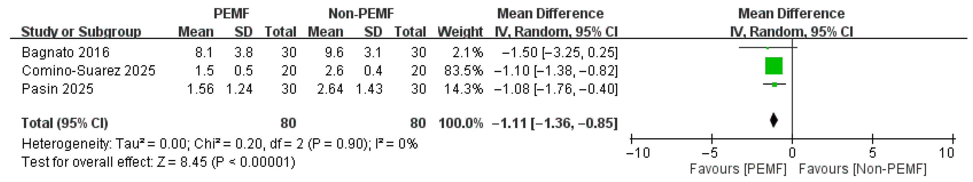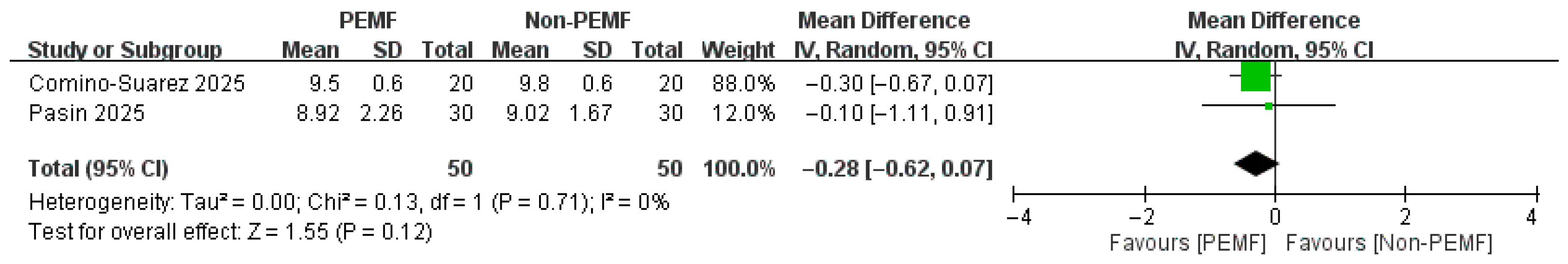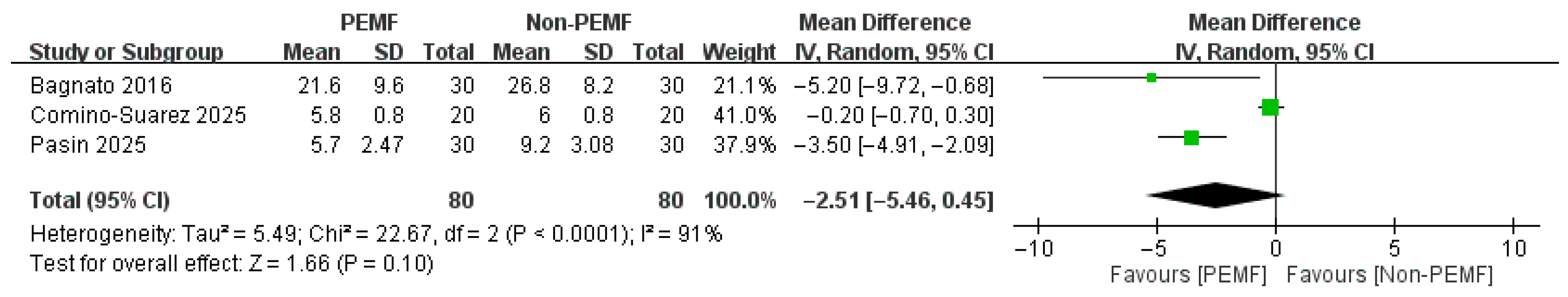 | Comino-Suárez, 2025 [33] | 20/20 | 10 mT/50 Hz | WOMAC, VAS pain score (0–10), TUG |