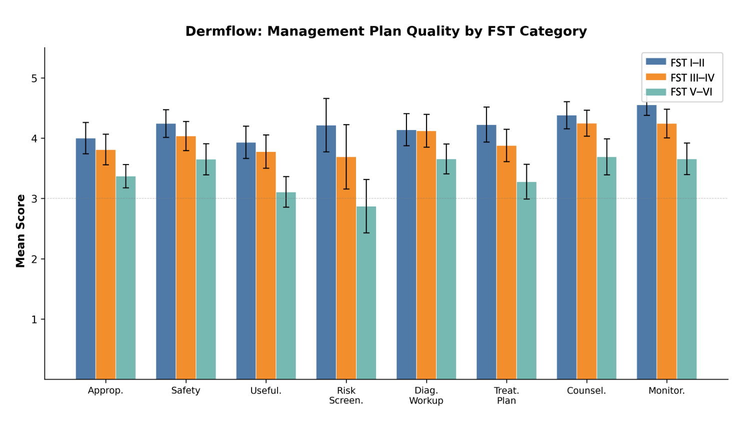 The significant and consistent decline in management quality for darker skin tones across both systems is the more consequential finding. Composite scores declined from 4.20 to 3.47 (Dermflow) and 4.35 to 3.44 (Claude) between FST I–II and FST V–VI, with most pairwise FST comparisons reaching statistical significance. This pattern persisted across all eight clinical dimensions, suggesting a systematic rather than domain-specific limitation. Critically, this degradation occurred despite both models receiving the correct diagnosis prior to management plan generation, indicating that the disparity operates at the level of therapeutic reasoning rather than diagnostic performance. One nuance warrants attention: for Dermflow, the decline in composite management quality between FST I–II and FST III–IV did not reach statistical significance (p = 0.143), while the analogous comparison for Claude was significant (p = 0.002). This suggests that Dermflow may exhibit a somewhat more gradual onset of FST-related management degradation compared to Claude, though both systems showed a significant decline between FST III–IV and FST V–VI. The observation that neoplastic conditions showed no significant FST-related management degradation, while inflammatory conditions drove the observed disparity, suggests that the underlying training data may be differentially limited in representing inflammatory disease management across diverse skin tones.