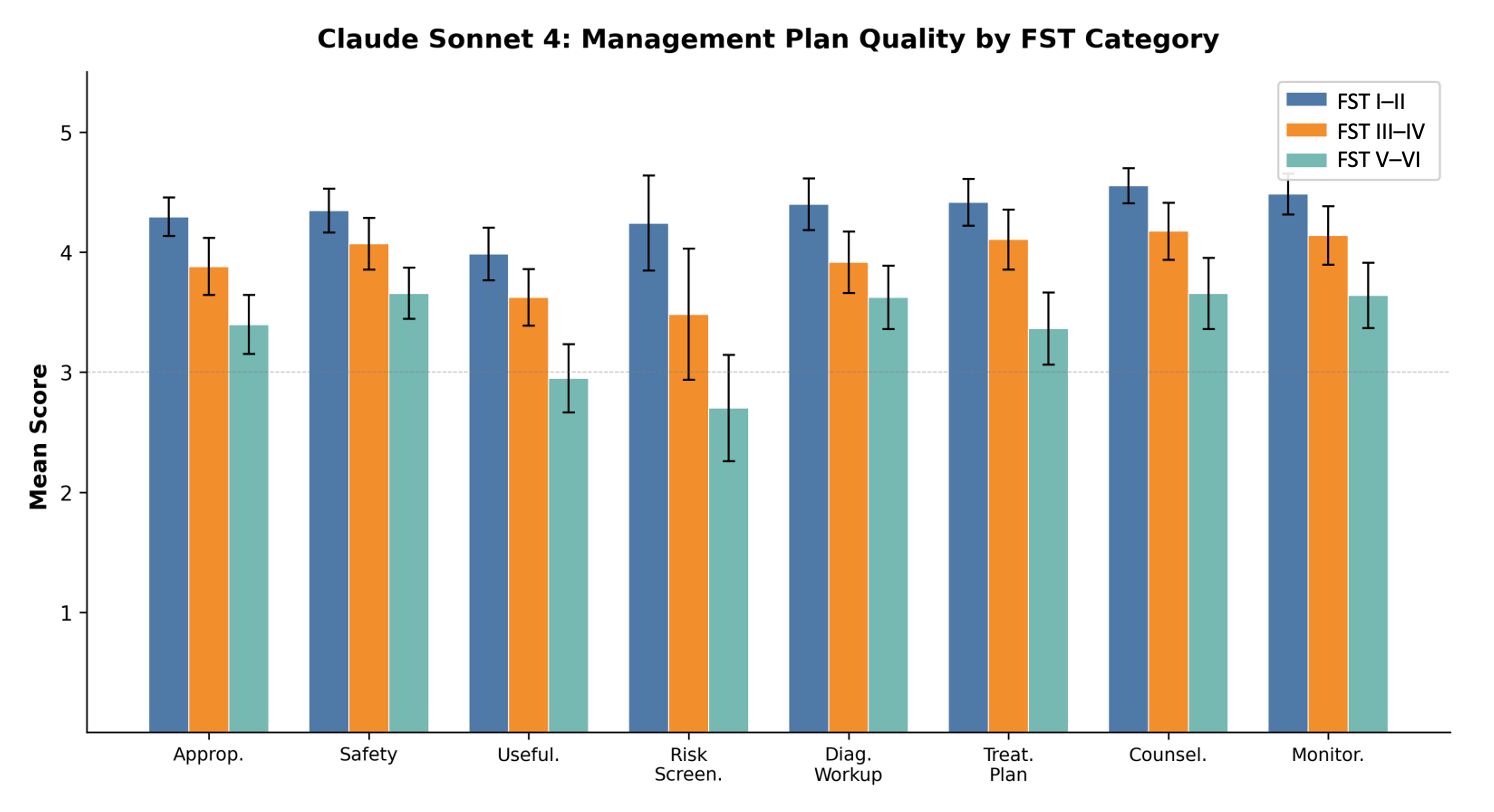 Several potential explanations deserve consideration. First, neoplastic management guidelines are relatively standardized across populations, including excision margins, surveillance intervals, and referral thresholds. On the other hand, inflammatory disease management is more contextually variable and population-specific. Treatment selection for psoriasis, atopic dermatitis, and other chronic inflammatory conditions may appropriately differ across skin tones: phototherapy response varies with baseline pigmentation and carries differential hyperpigmentation risk. Training data for large language models may underrepresent clinical guidelines, case reports, and therapeutic literature addressing inflammatory skin disease management in patients with darker skin, meaning that both models may have encountered fewer high-quality examples of condition-specific inflammatory management tailored to patients with FST V–VI. Second, the observed pattern could partially reflect reviewer-side effects as dermatologists may apply heightened scrutiny to management recommendations for underrepresented populations, reflecting awareness of historical care inequities. Disentangling these contributions will require prospective studies with objective outcome measures rather than subjective quality ratings.
