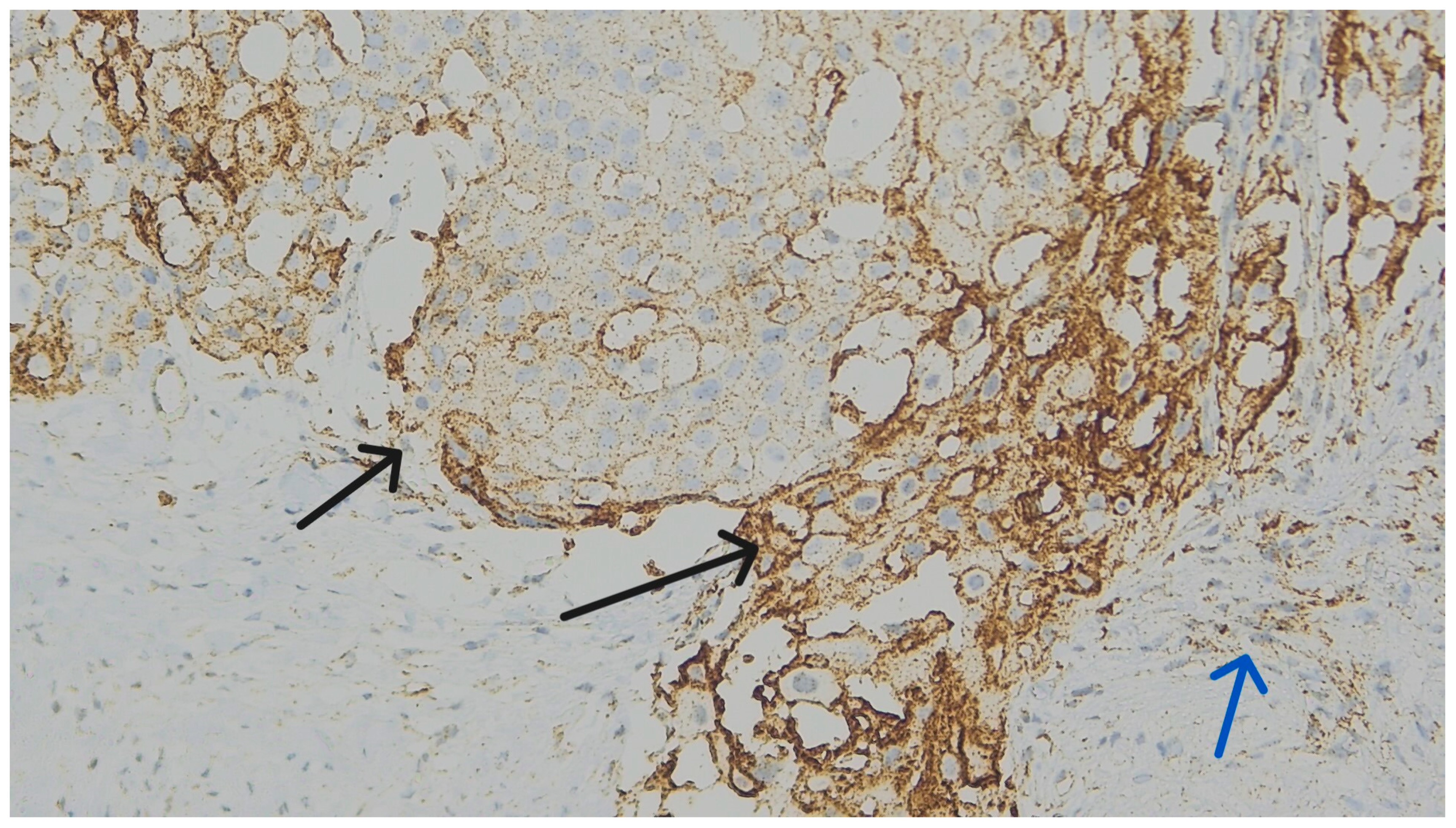 Because MBC has a very marked morphological heterogeneity, we sought to evaluate PD-L1 expression across all the identifiable histologic components. These included squamous, spindle cell, chondroid, osseous, and matrix-producing areas. When a tumor showed heterogeneous staining patterns, we did not limit our assessment to a single component. Instead, our CPS scoring was based on an overall assessment of representative tumor zones. We prioritized areas dominated by the invasive tumor, and minor components comprising less than 10% of the total tumor volume were not evaluated separately.