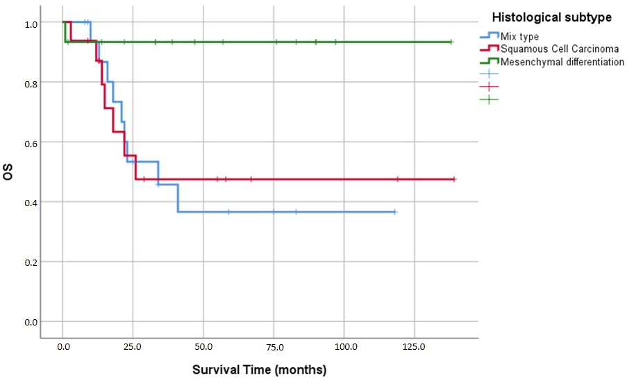 p = 0.029). Specifically, mean survival times were 57.7 ± 12.6 months for the mixed variant, 74.5 ± 17.0 months for squamous cell carcinoma, and notably longer at 128.9 ± 8.8 months for tumors demonstrating mesenchymal differentiation (