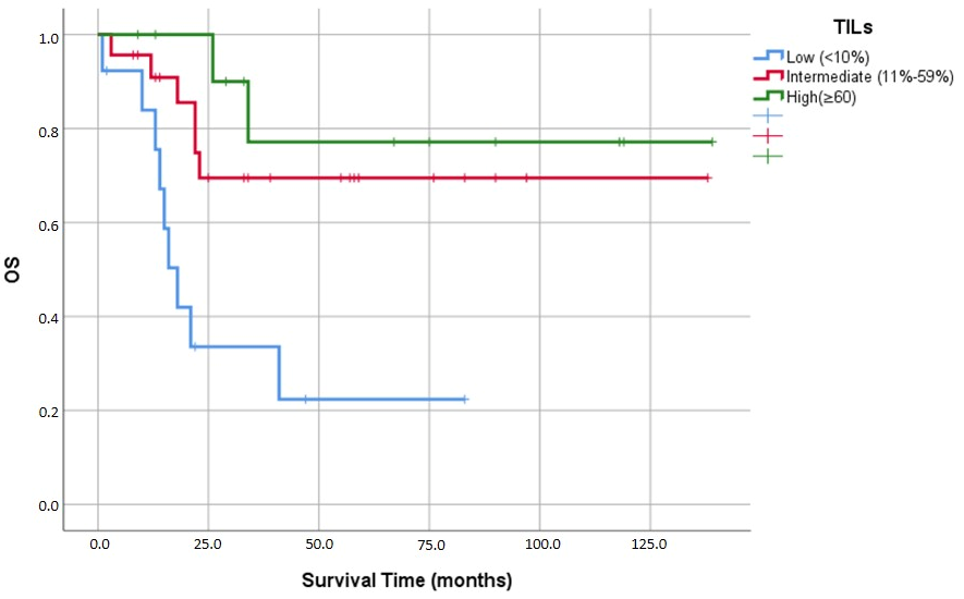 p = 0.001). Patients with low TIL levels experienced a markedly shorter mean survival duration (32.2 ± 8.6 months). By contrast, survival extended substantially as lymphocytic infiltration increased, reaching 101.1 ± 12.6 months and 114.2 ± 15.6 months in the moderate and high TILs groups, respectively (