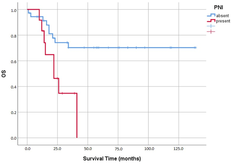 Perineural invasion (PNI) showed significant association with mortality in univariate analysis (p = 0.015) and Kaplan–Meier analysis (p = 0.008), with striking survival differences: 102.8 ± 10.2 months in PNI-negative versus 25.8 ± 3.9 months in PNI-positive patients. However, PNI was not an independent prognostic factor in multivariate Cox regression (HR = 1.39; 95% CI: 0.46–4.18; p = 0.554).