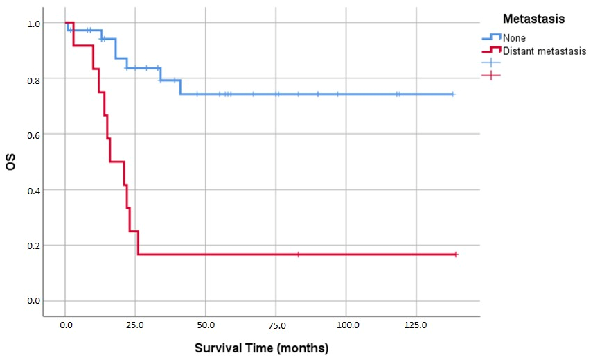 Metastasis status was the most significant predictor of survival in this study. Univariate analysis showed a dramatic reduction in survival for patients with distant metastasis (36.7 ± 13.3 months) compared to those without (108.5 ± 9.8 months; p < 0.001). Furthermore, multivariate Cox regression confirmed metastasis as an independent prognostic factor, yielding a Hazard Ratio (HR) of 4.40 (95% CI: 1.22–15.81; p = 0.023).