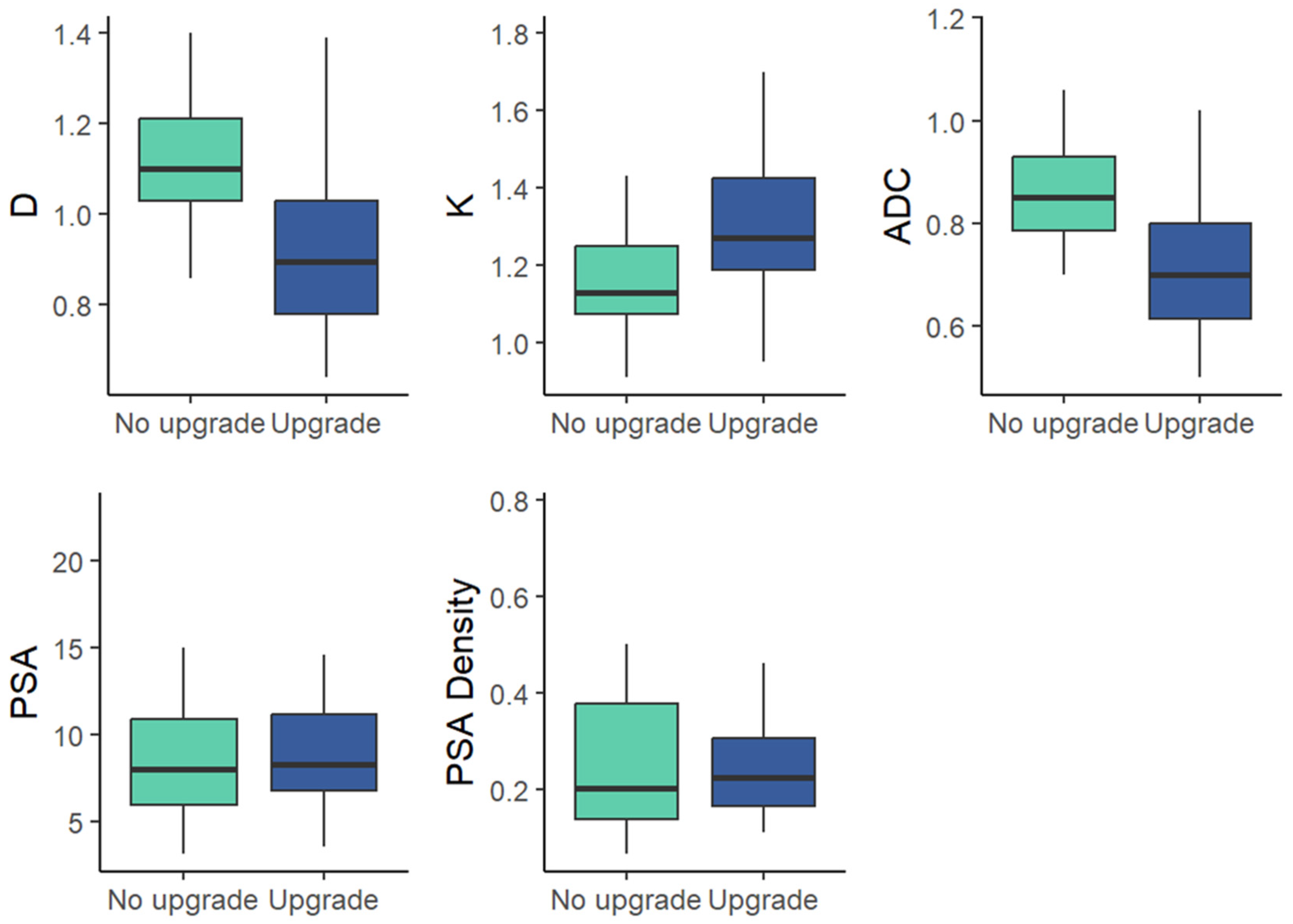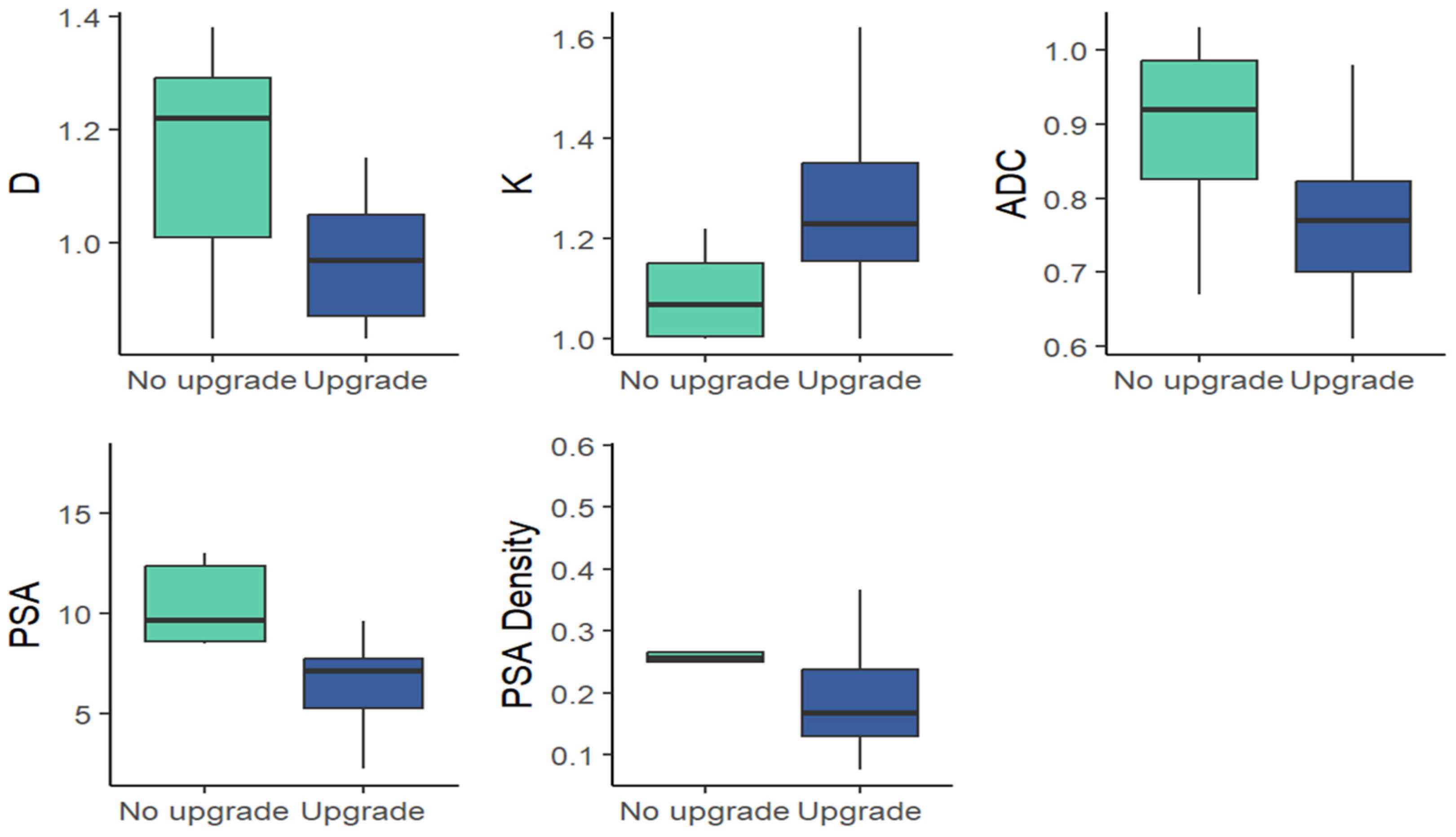 Mean values of K and ADC in tumors between the upgraded and non-upgraded cohorts were significantly different. In the upgraded cohort, mean ADC values in cancerous foci were significantly lower (0.761 vs. 0.891 × 10−3 s/mm2) and mean K values were significantly higher (1.262 vs. 1.086) in comparison to the cohort without an upgrade. Mean values of D between the upgraded and non-upgraded groups were not statistically significant (p > 0.05).